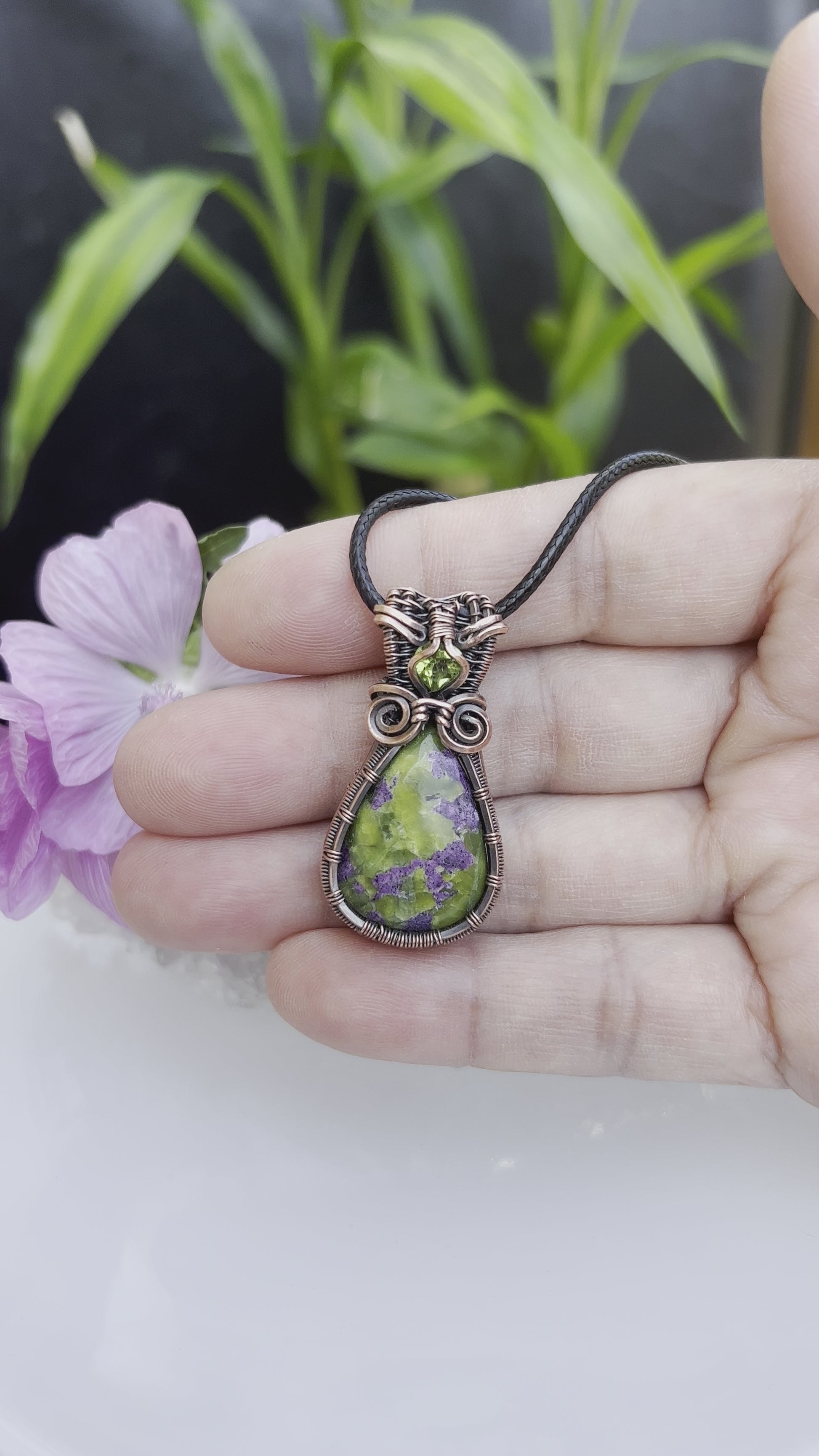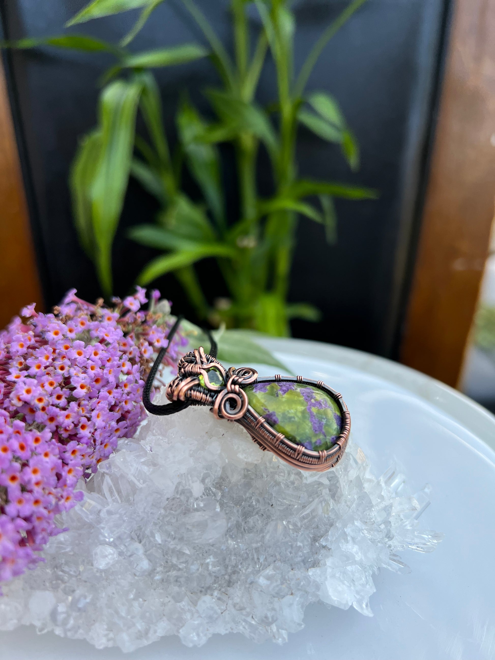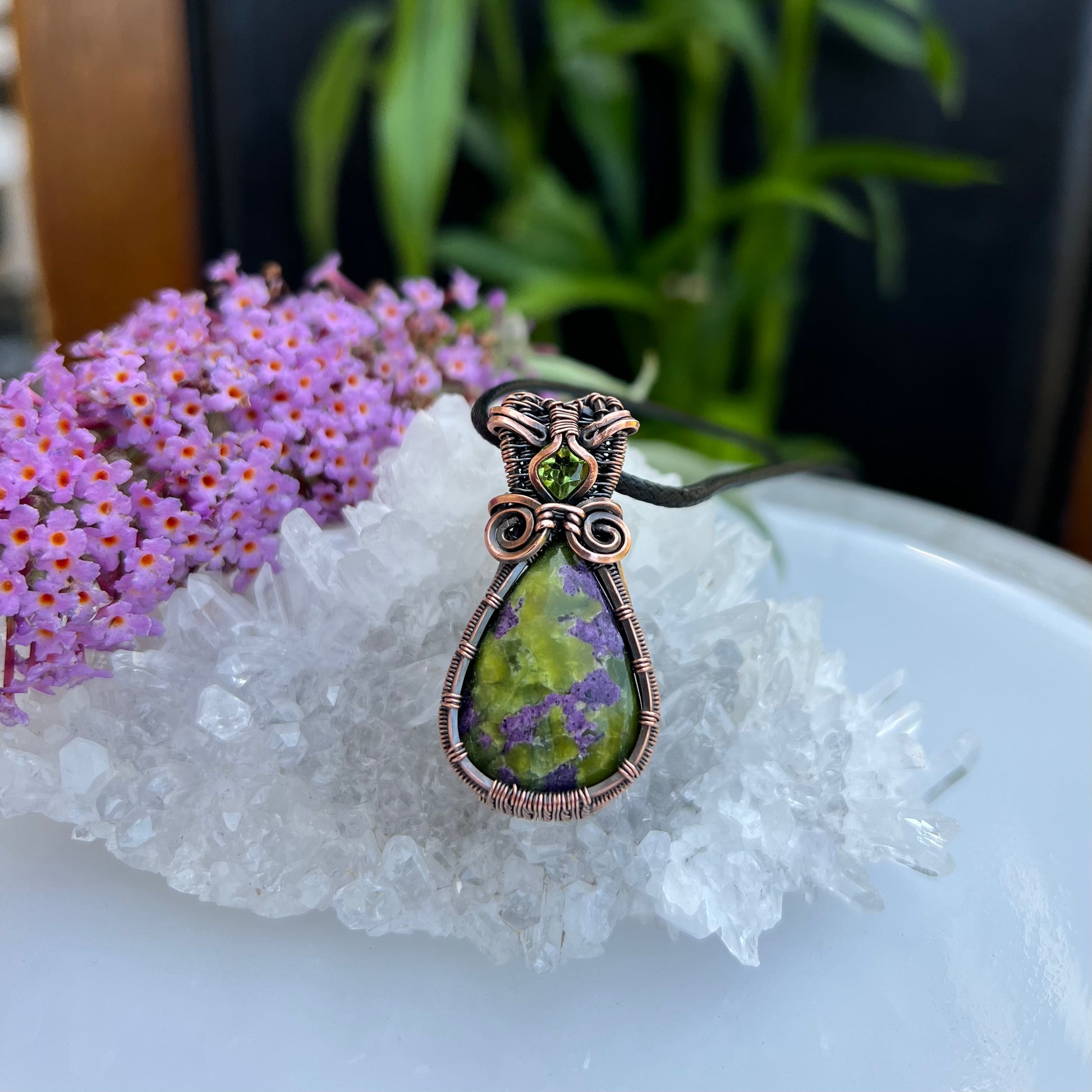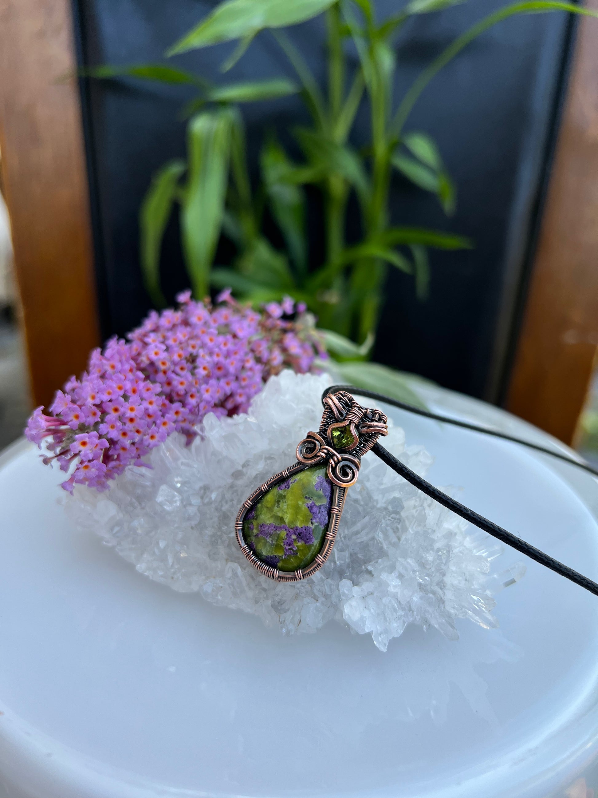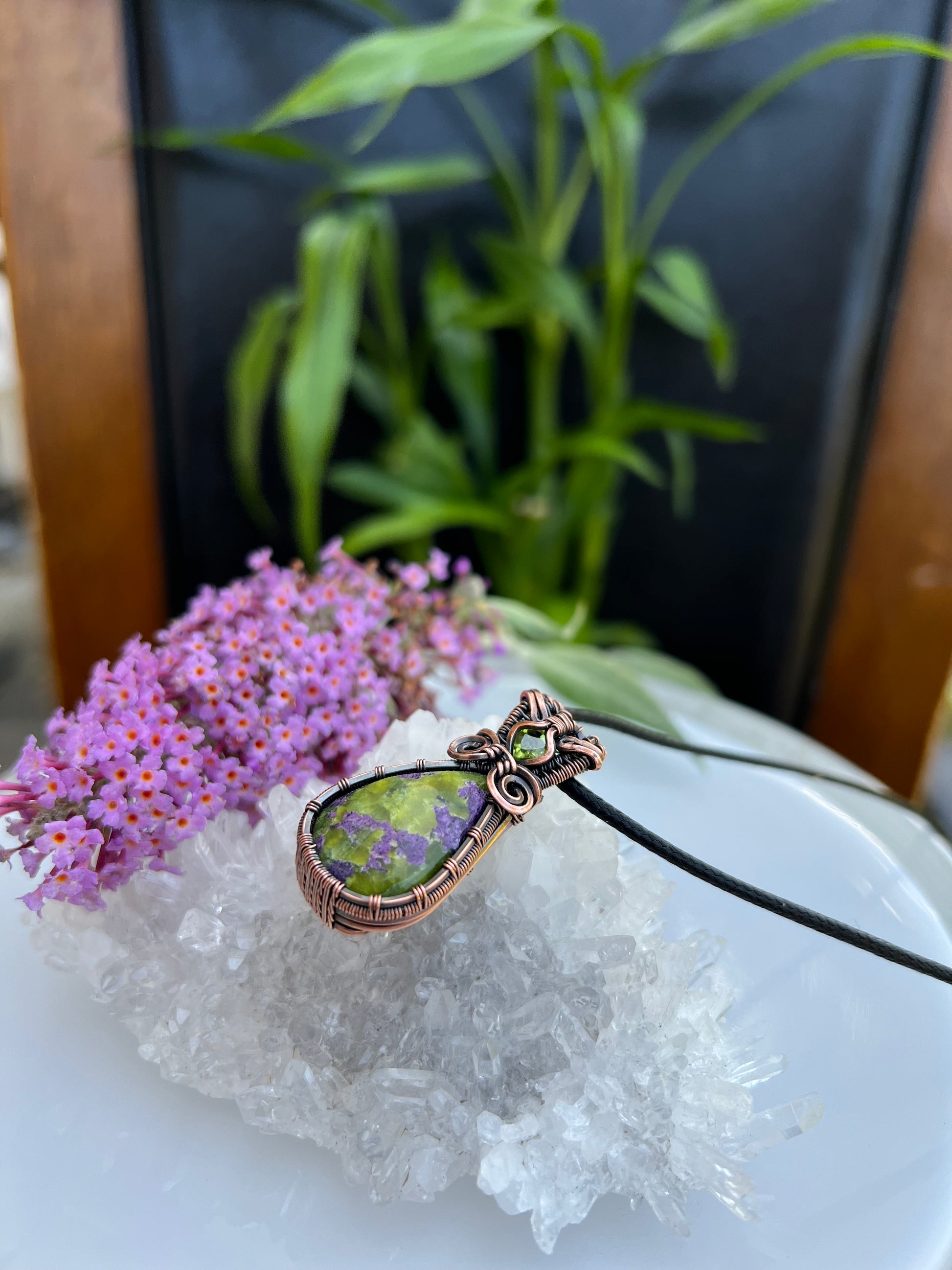 This beautiful pendant features Atlantisite with Peridot, set in pure copper wire that has been oxidized and hand polished.