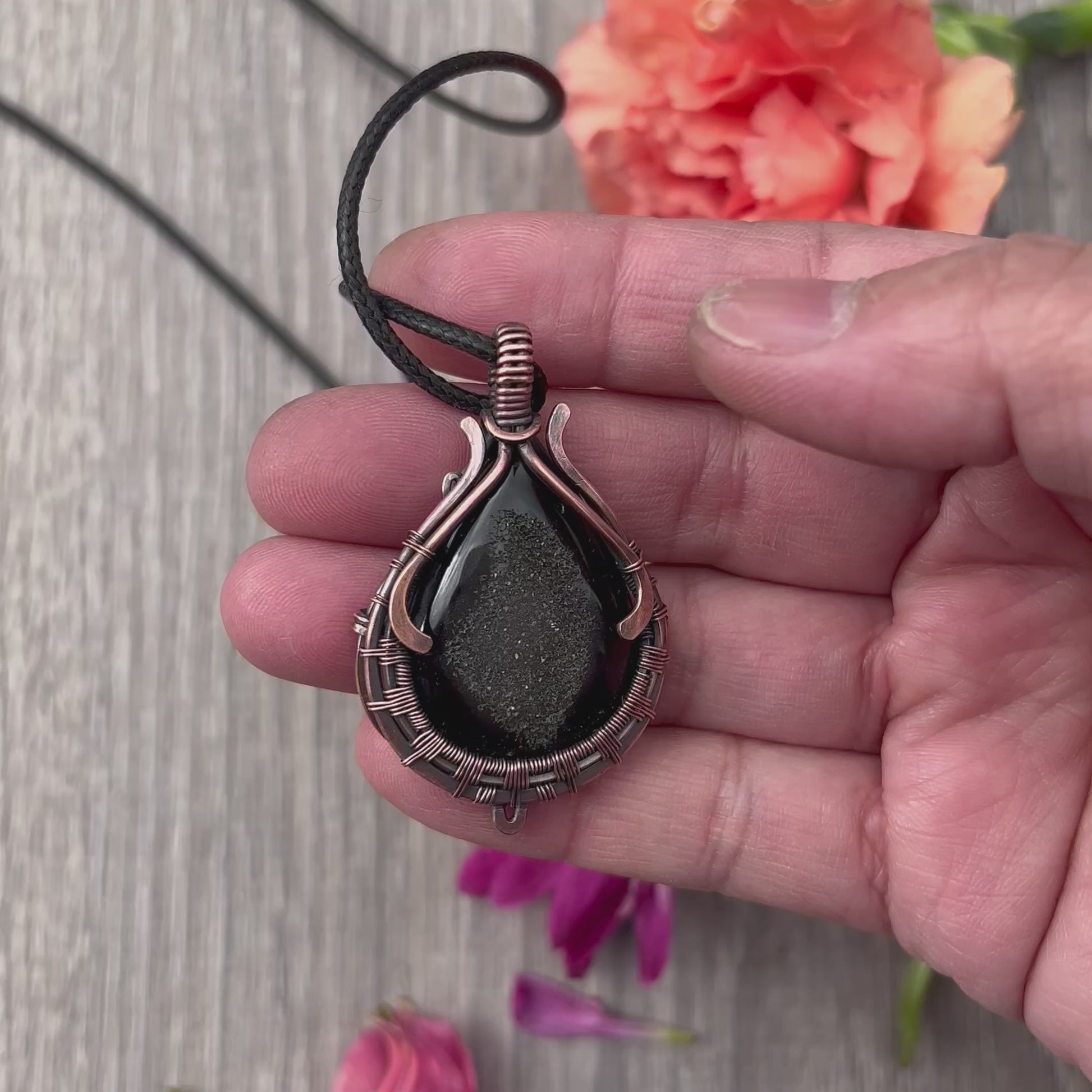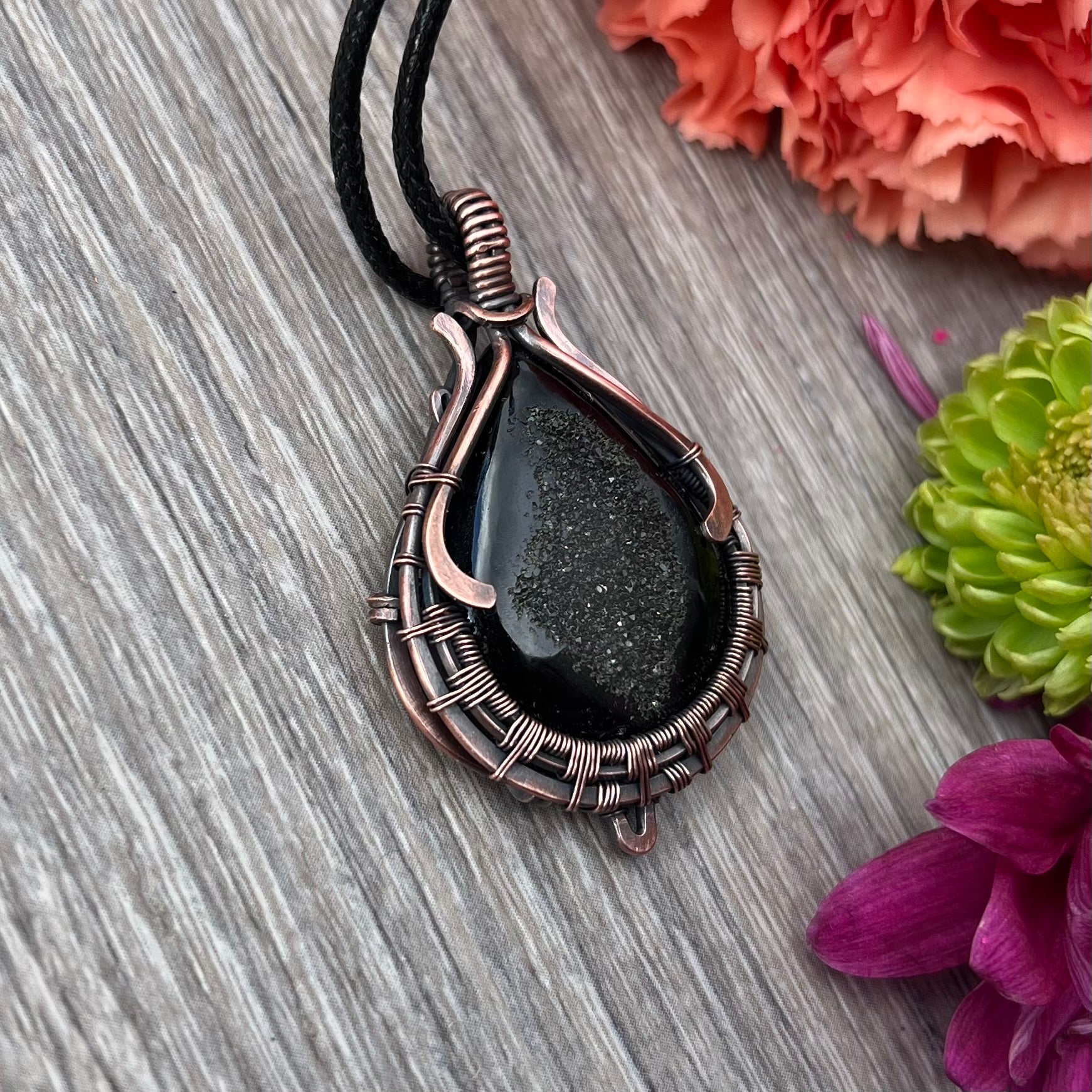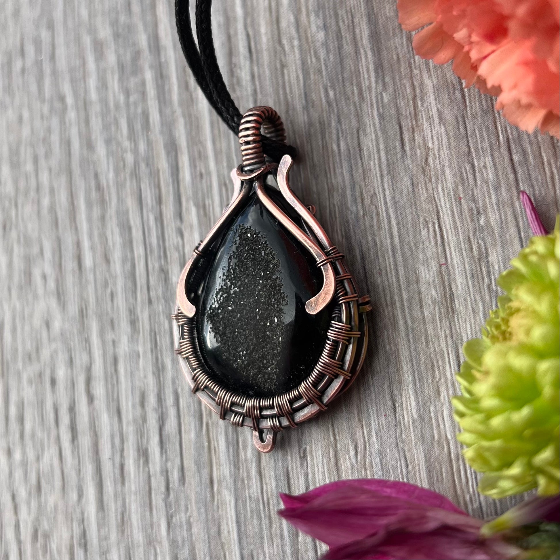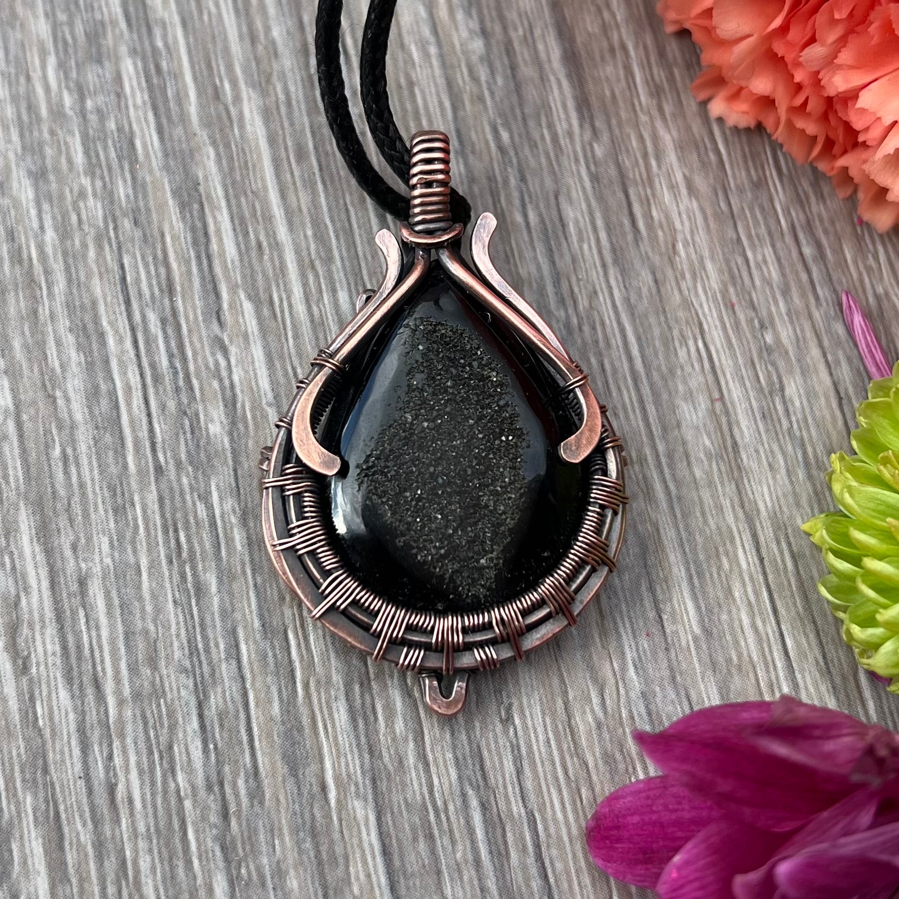 This beauty features a Black Onyx Druzy woven in antiqued copper.