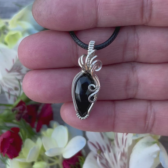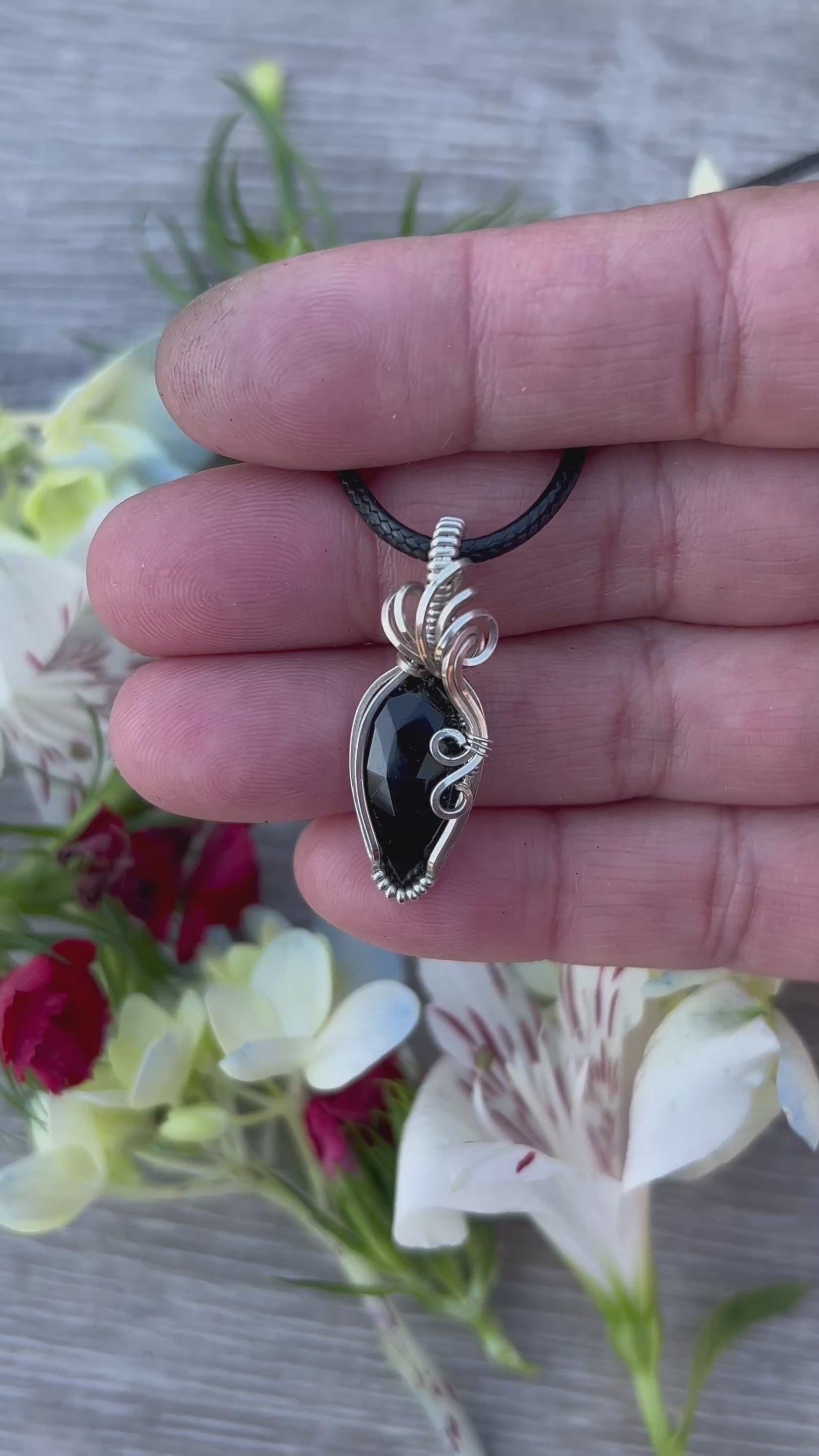 This elegant pendant features Black Onyx wrapped in Argentium Silver.