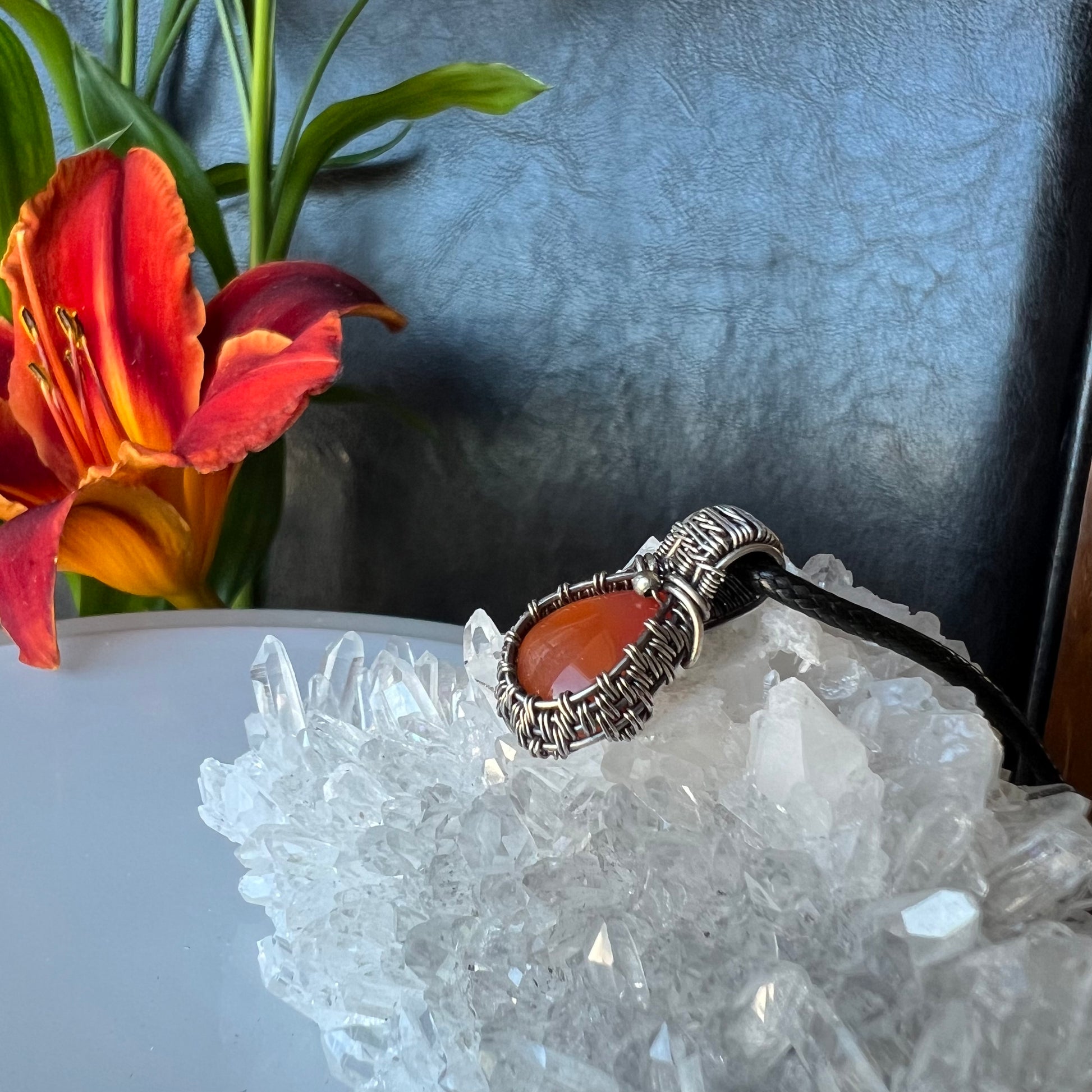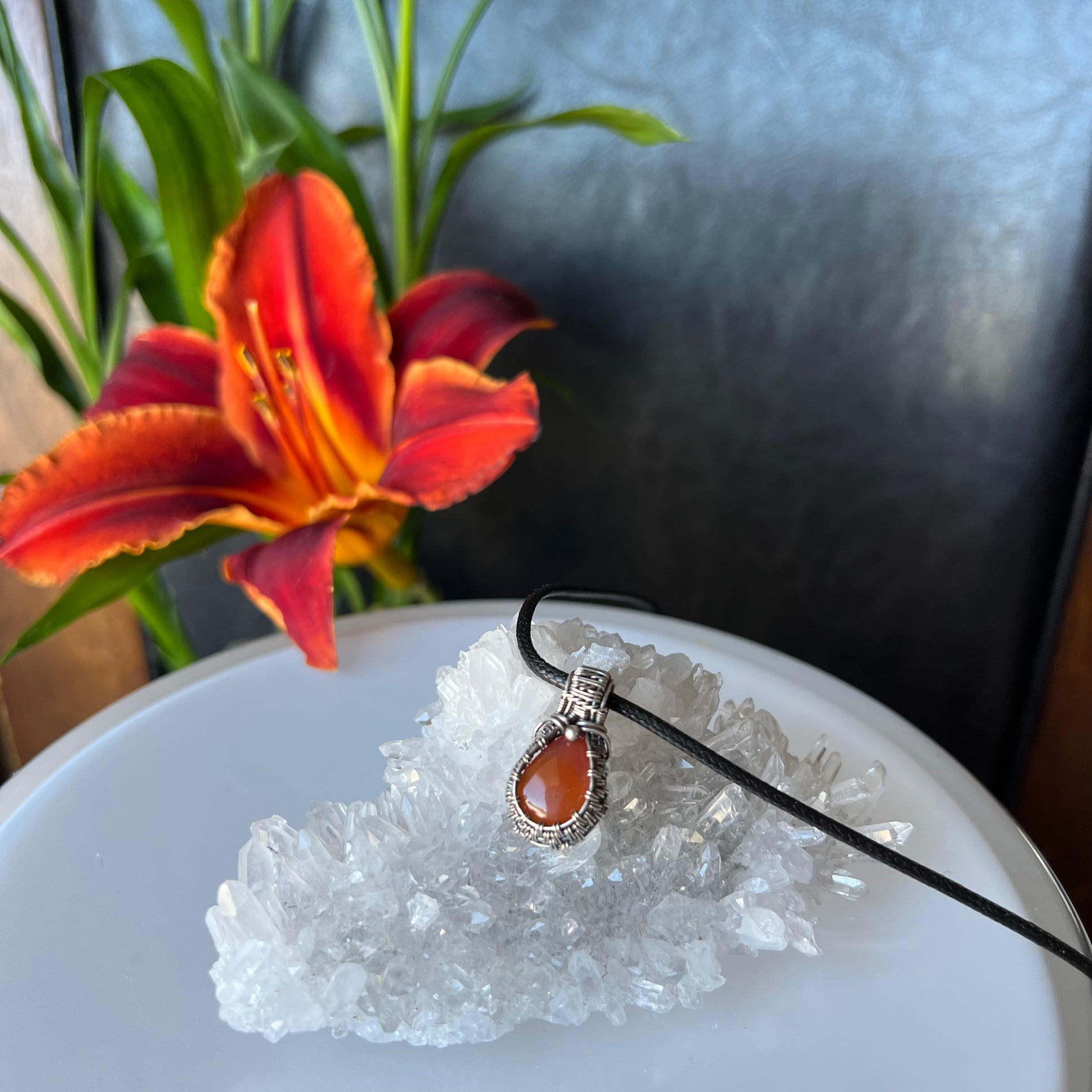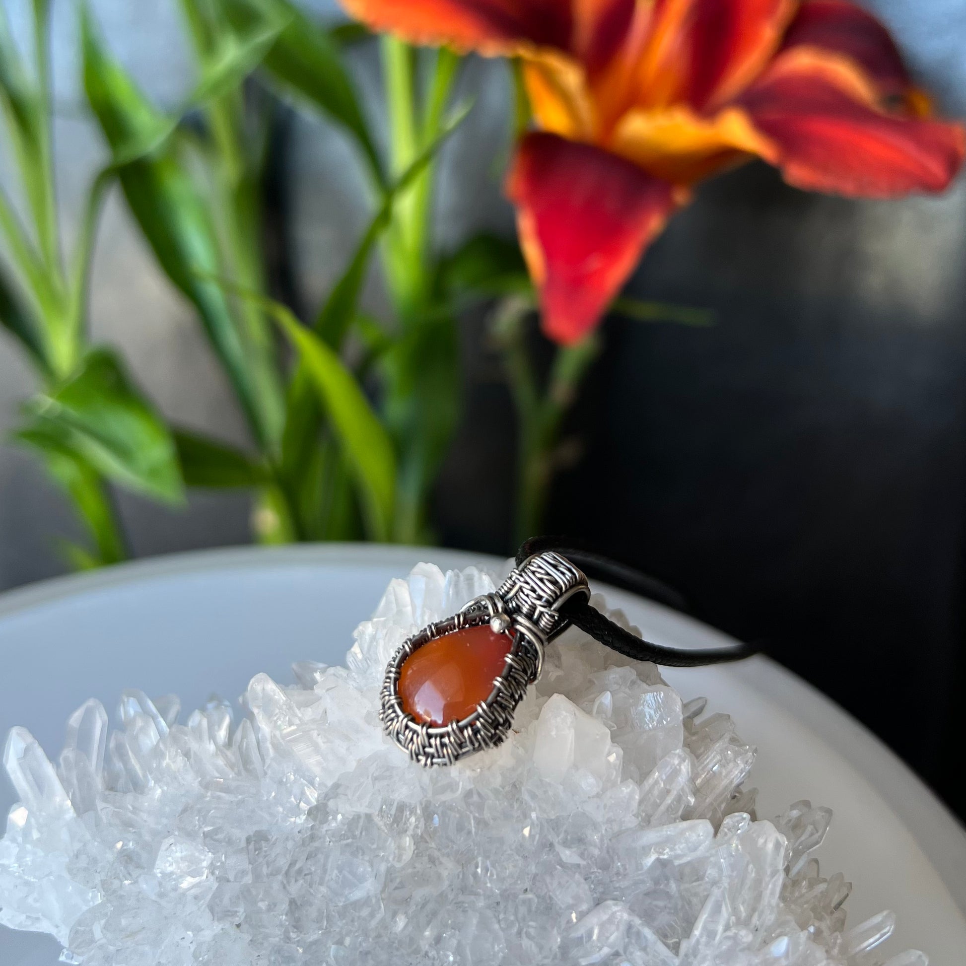 This beautiful mini pendant features a Carnelian, set in Solid Sterling Silver. This piece has been oxidized and hand polished.