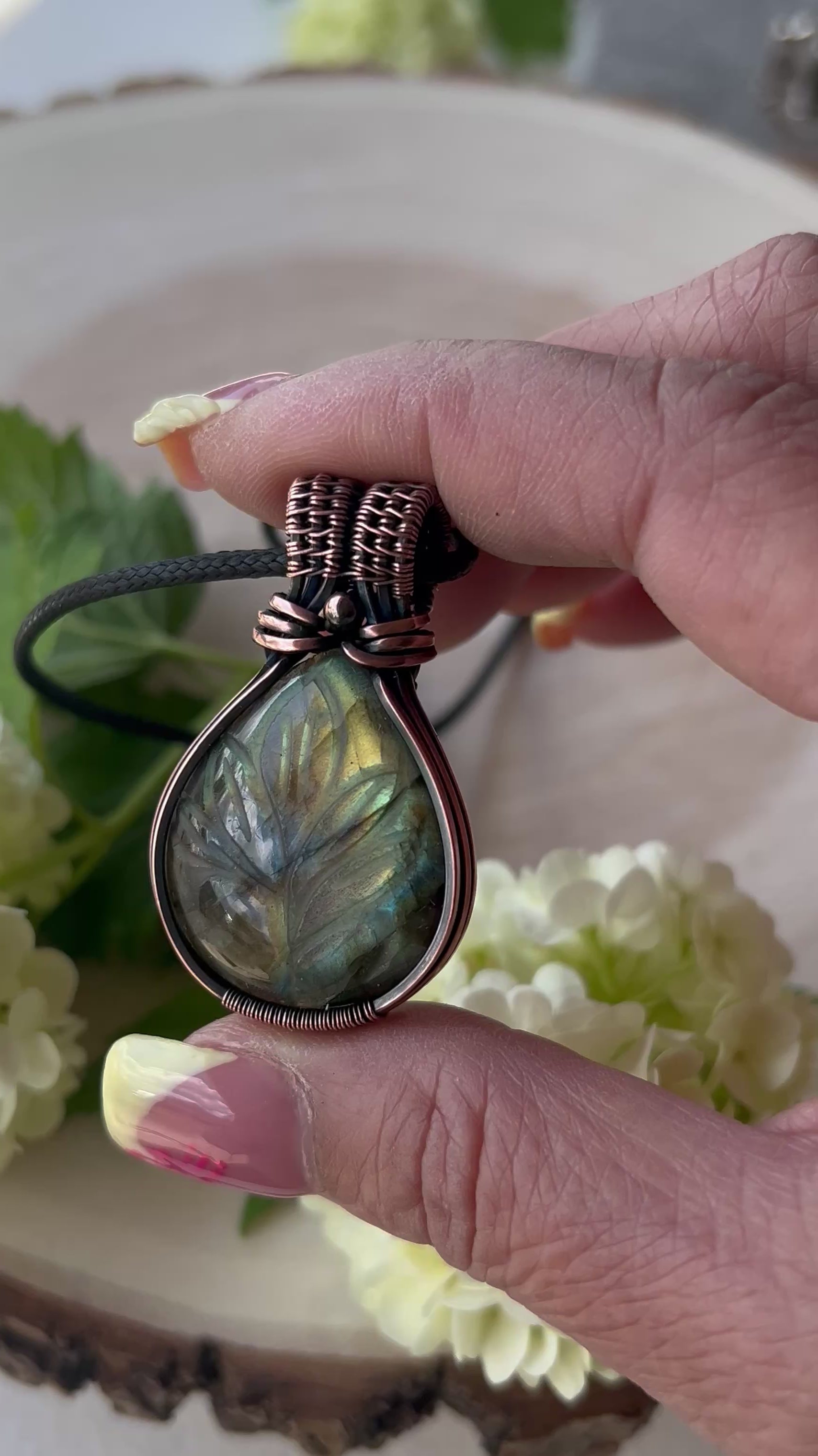 Carved Labradorite Pendant in antiqued Copper Wire