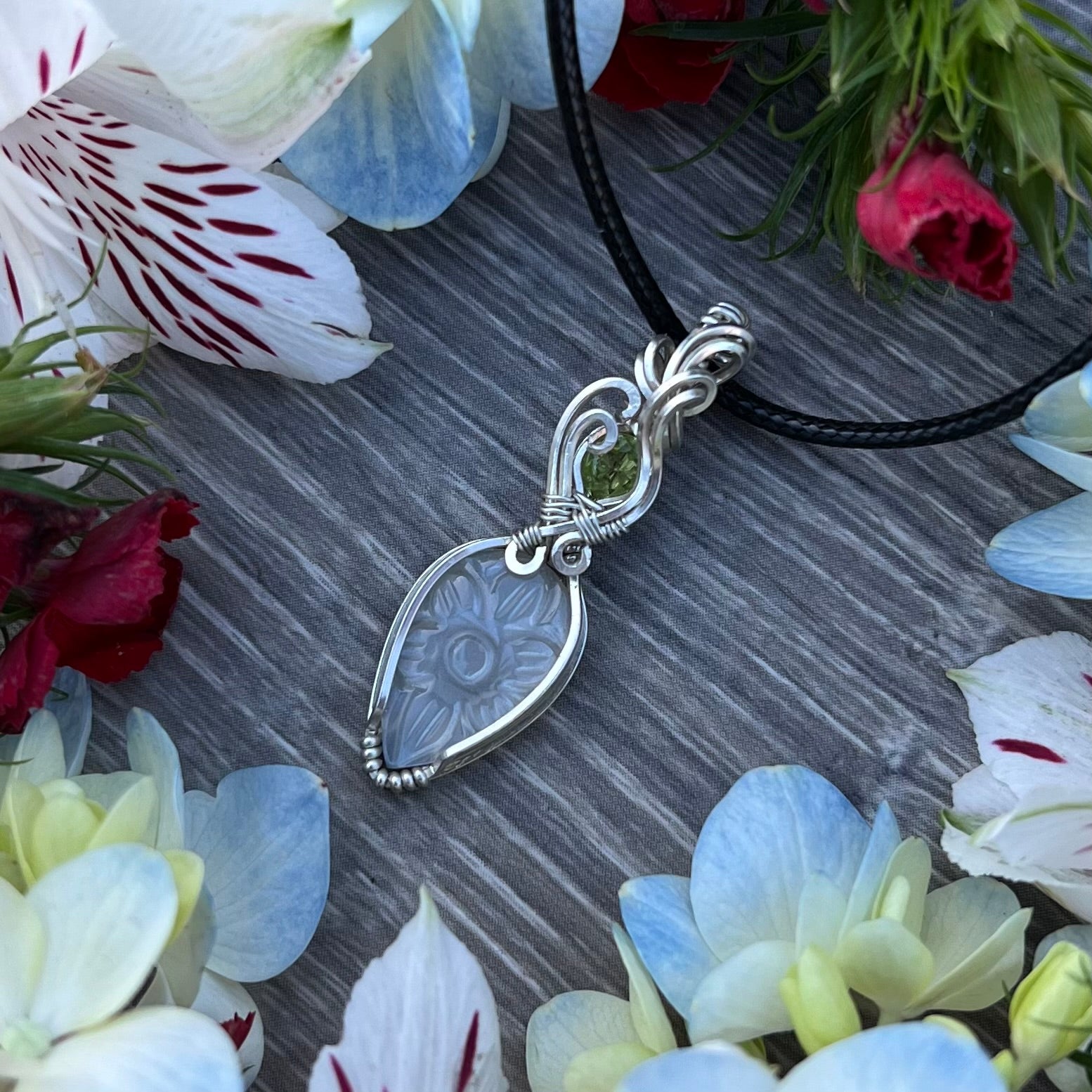 This elegant pendant features carved White Moonstone with Peridot accent wrapped in Argentium Silver.