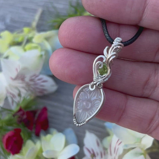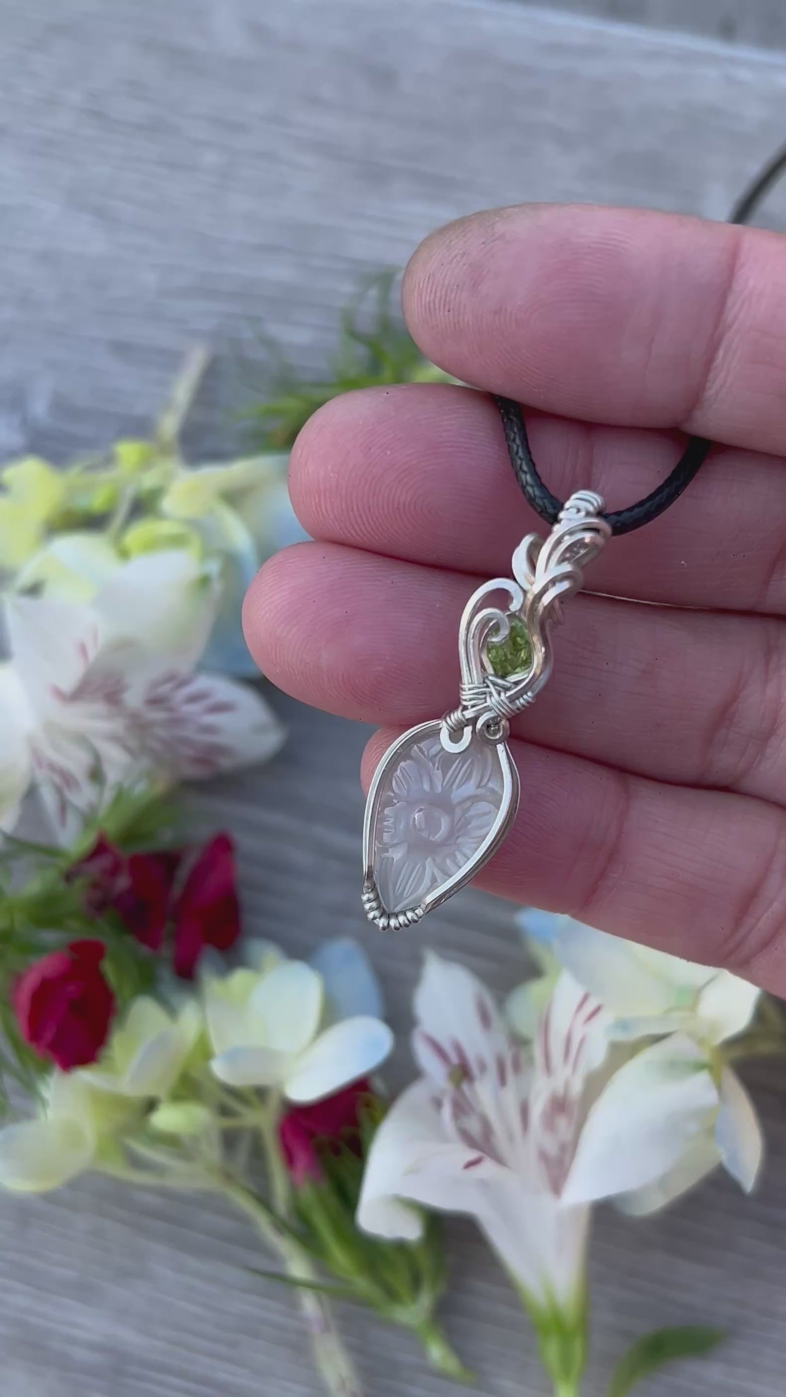 Carved White Moonstone with Peridot Pendant in Argentium Silver