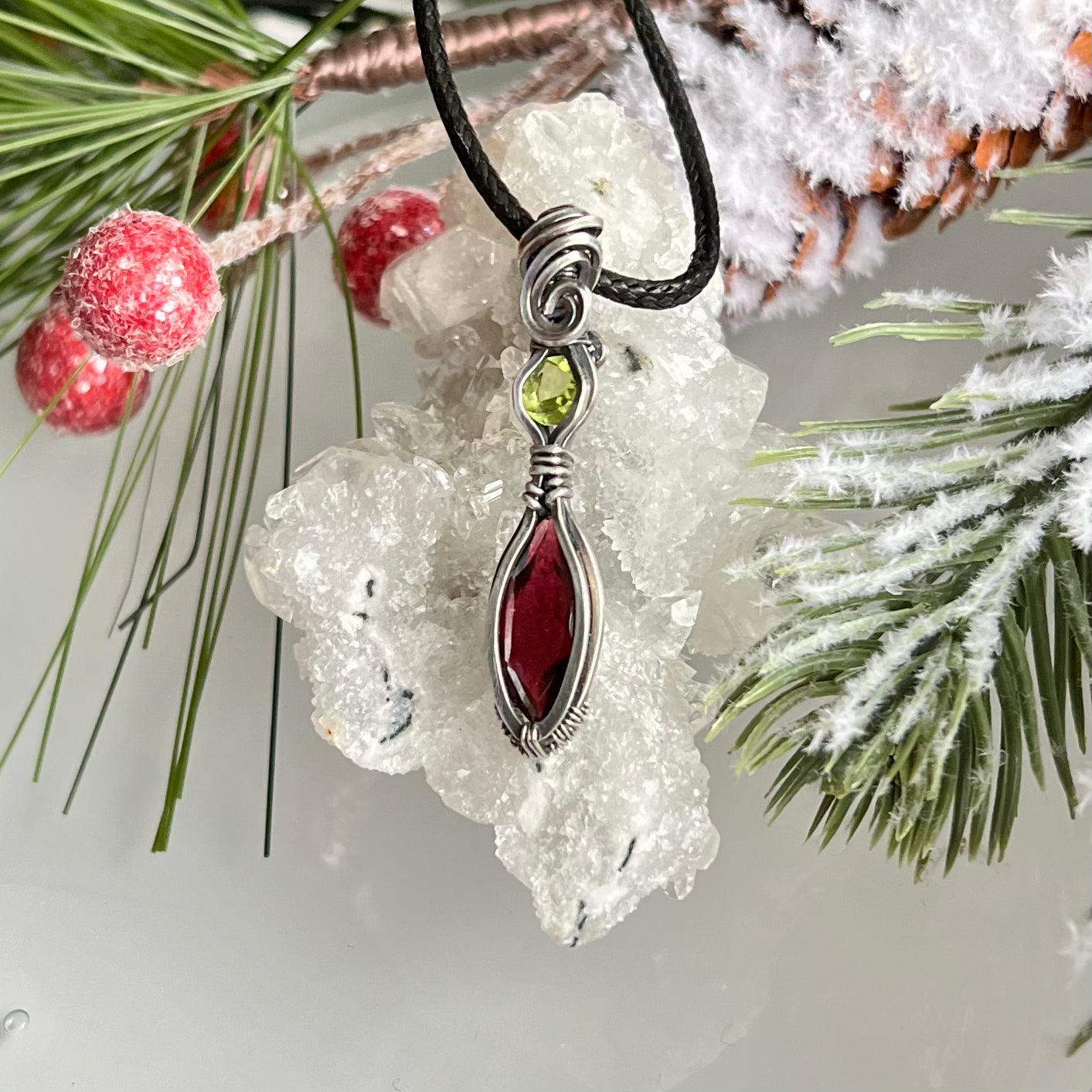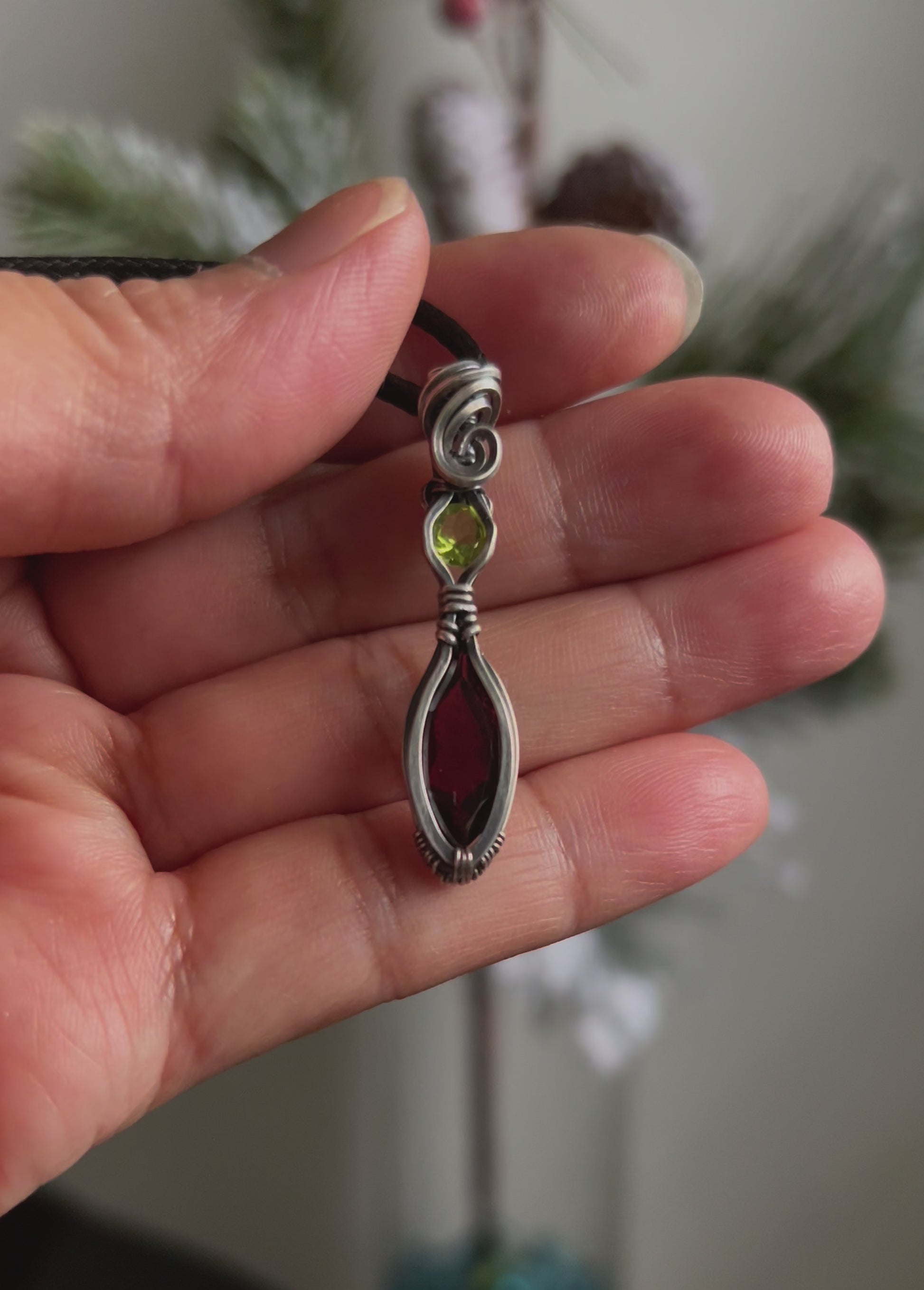 This pendant features faceted marquise shaped Garnet with Peridot set in Argentium Silver. This piece has been oxidized and hand polished.
