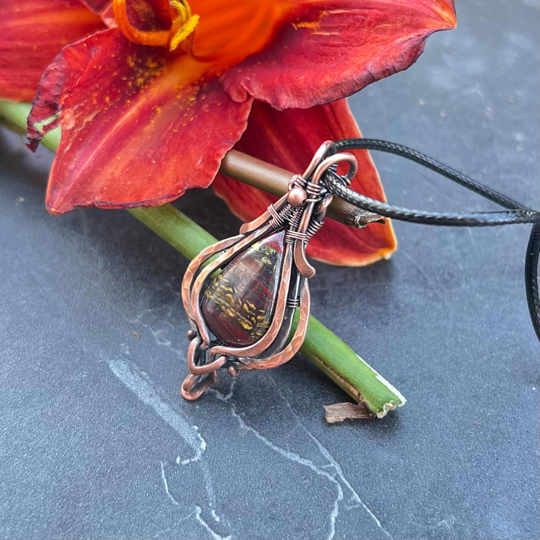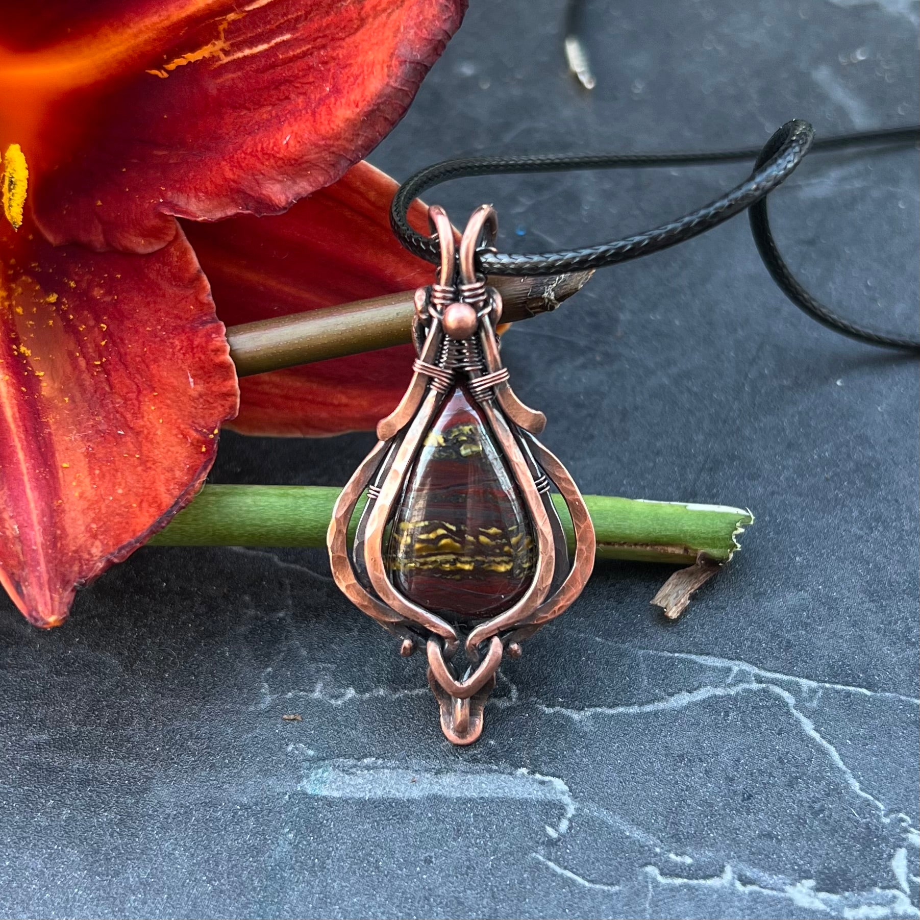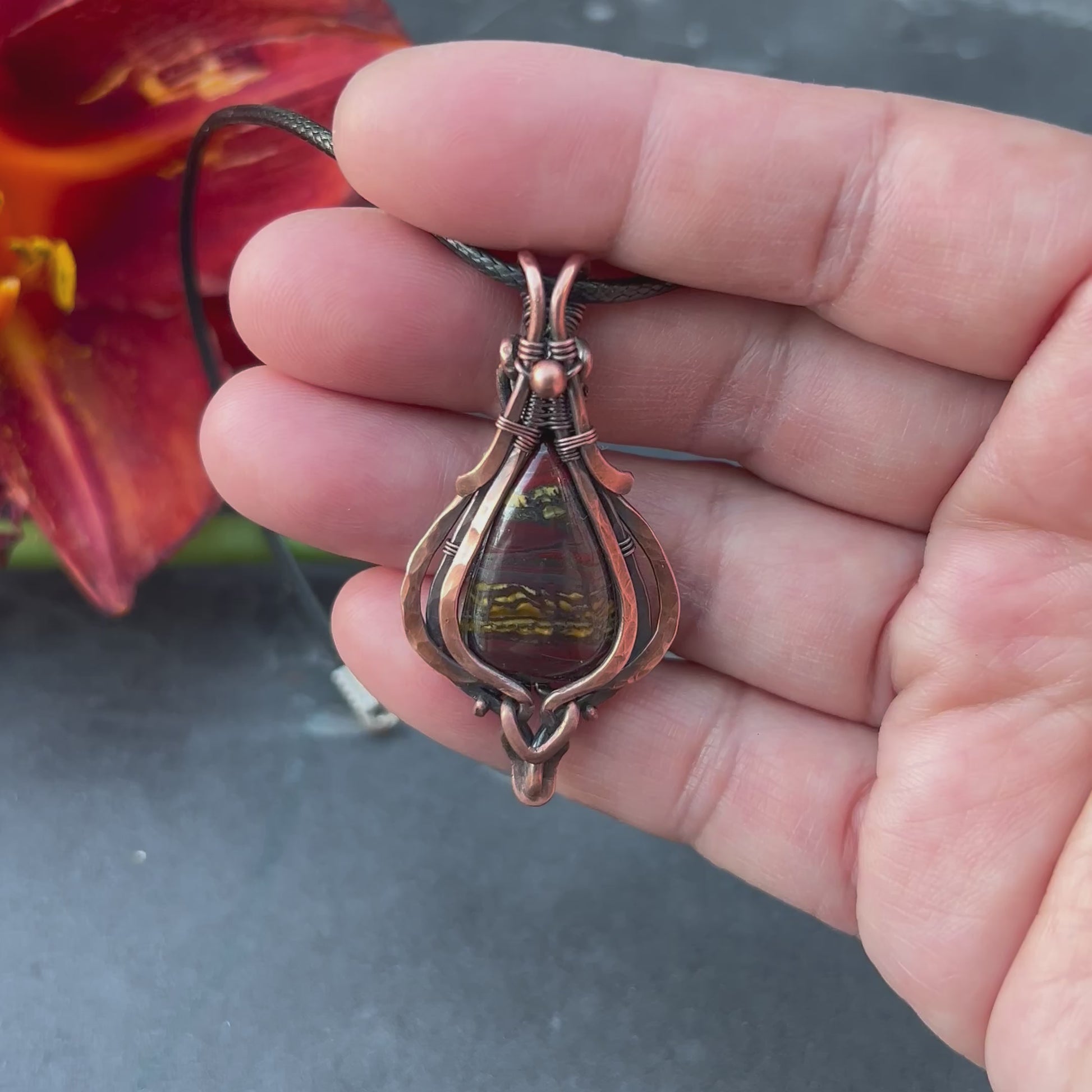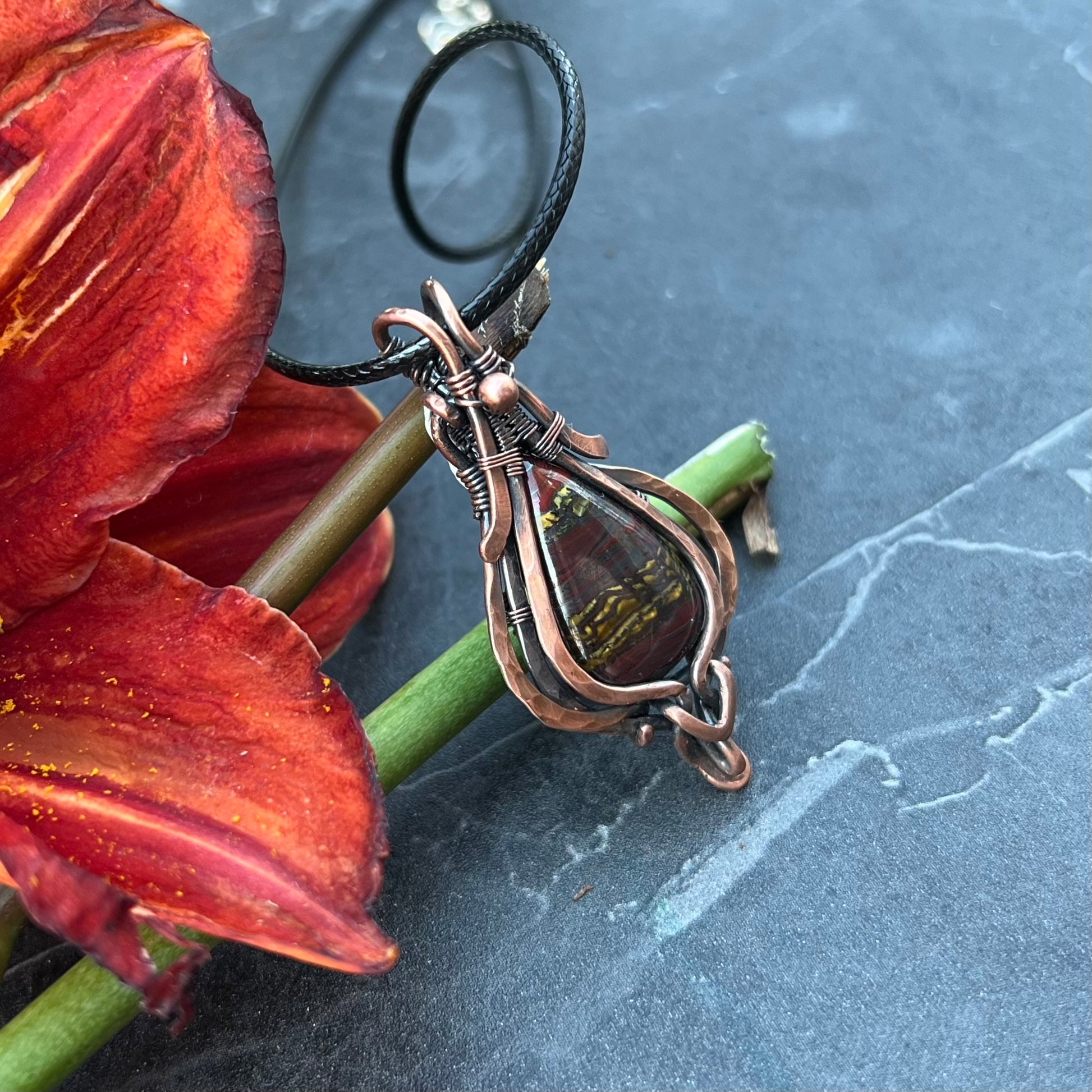 A Powerhouse pendant featuring Tiger Iron, set in hammered and oxidized copper wire. Iron Tiger is a combination of Golden Tiger’s Eye, Red Jasper, and Hematite!