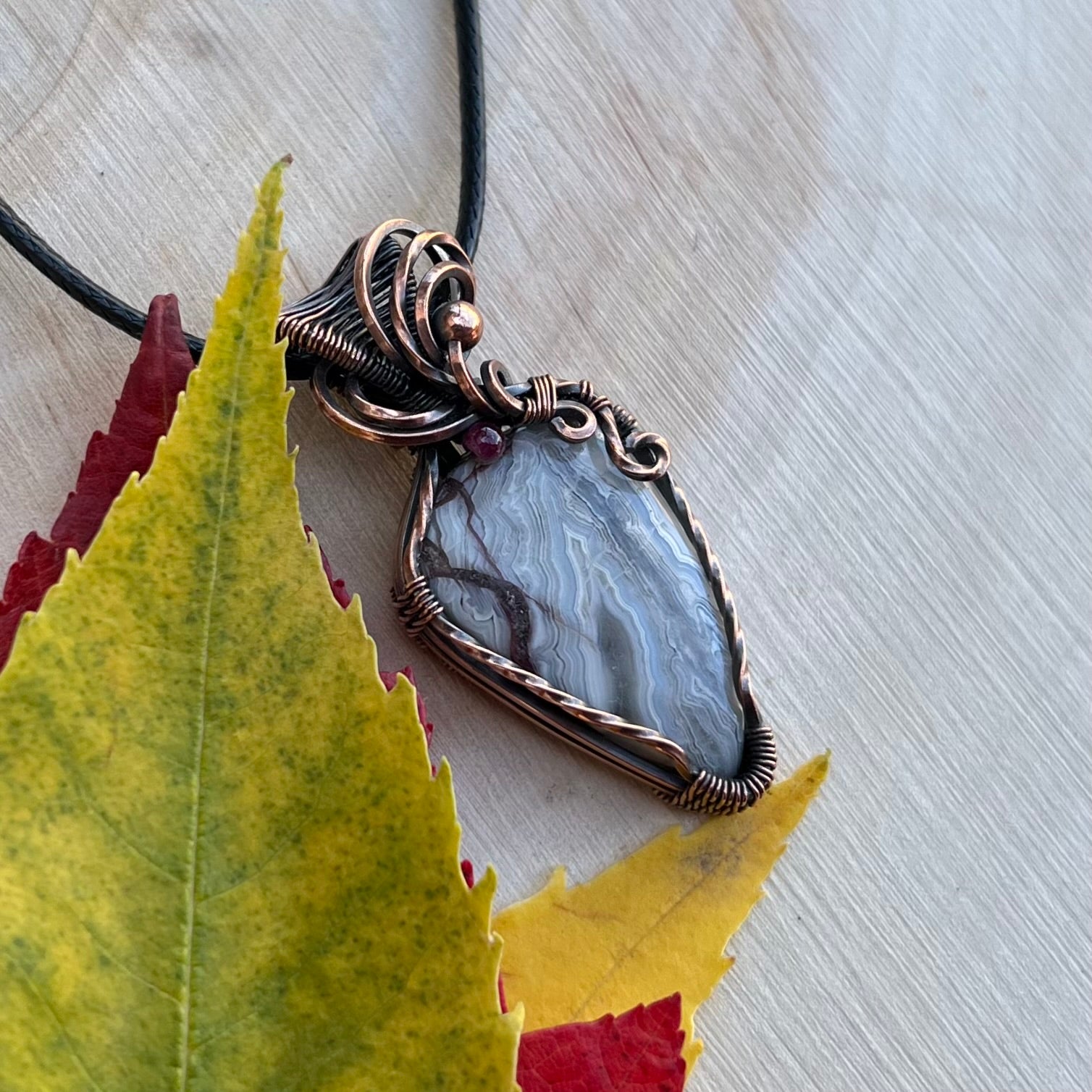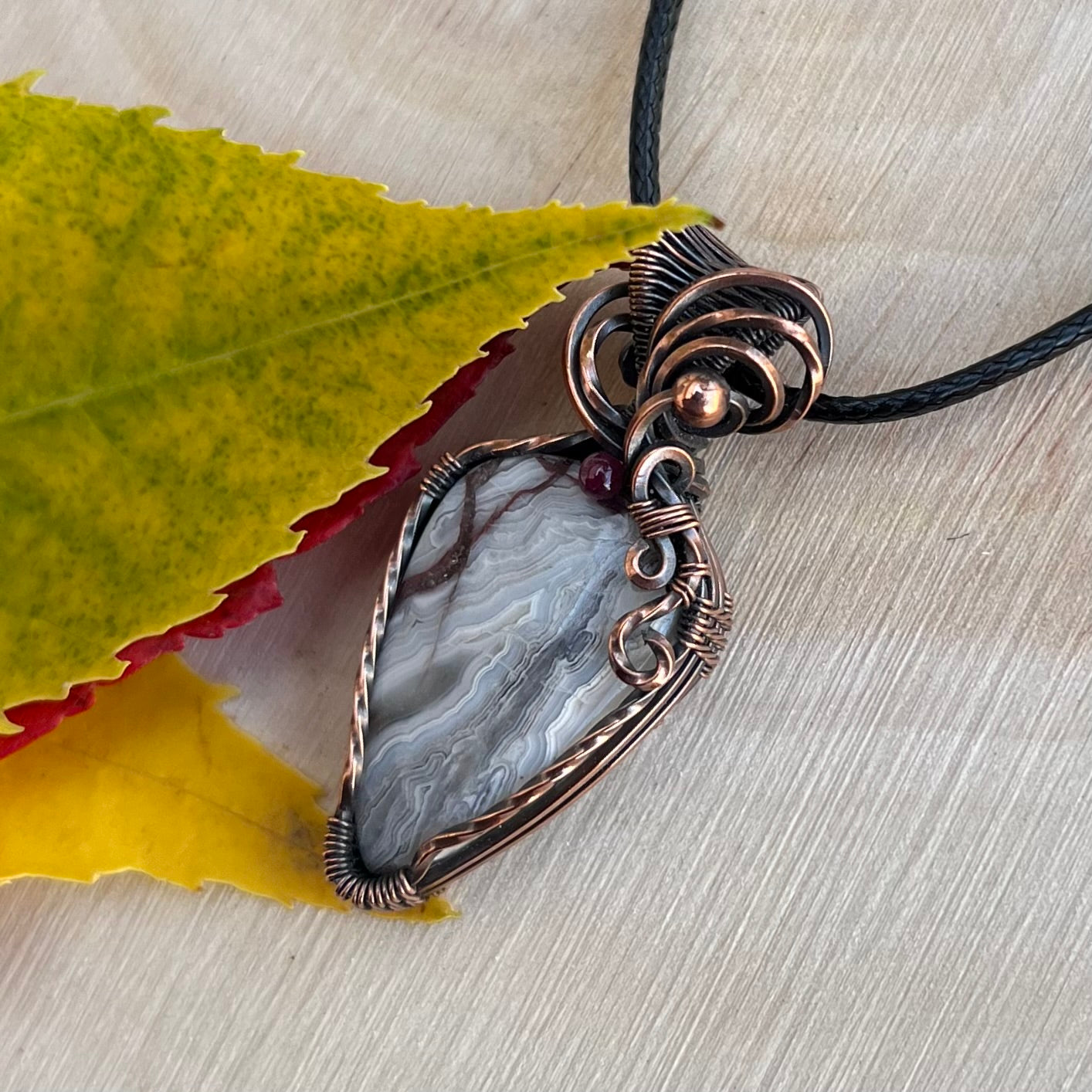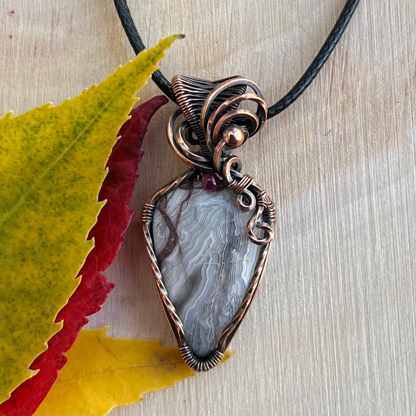 This beautiful pendant features Laguna Lace Agate with Garnet bead accent, set in Copper that has been oxidized and hand polished.