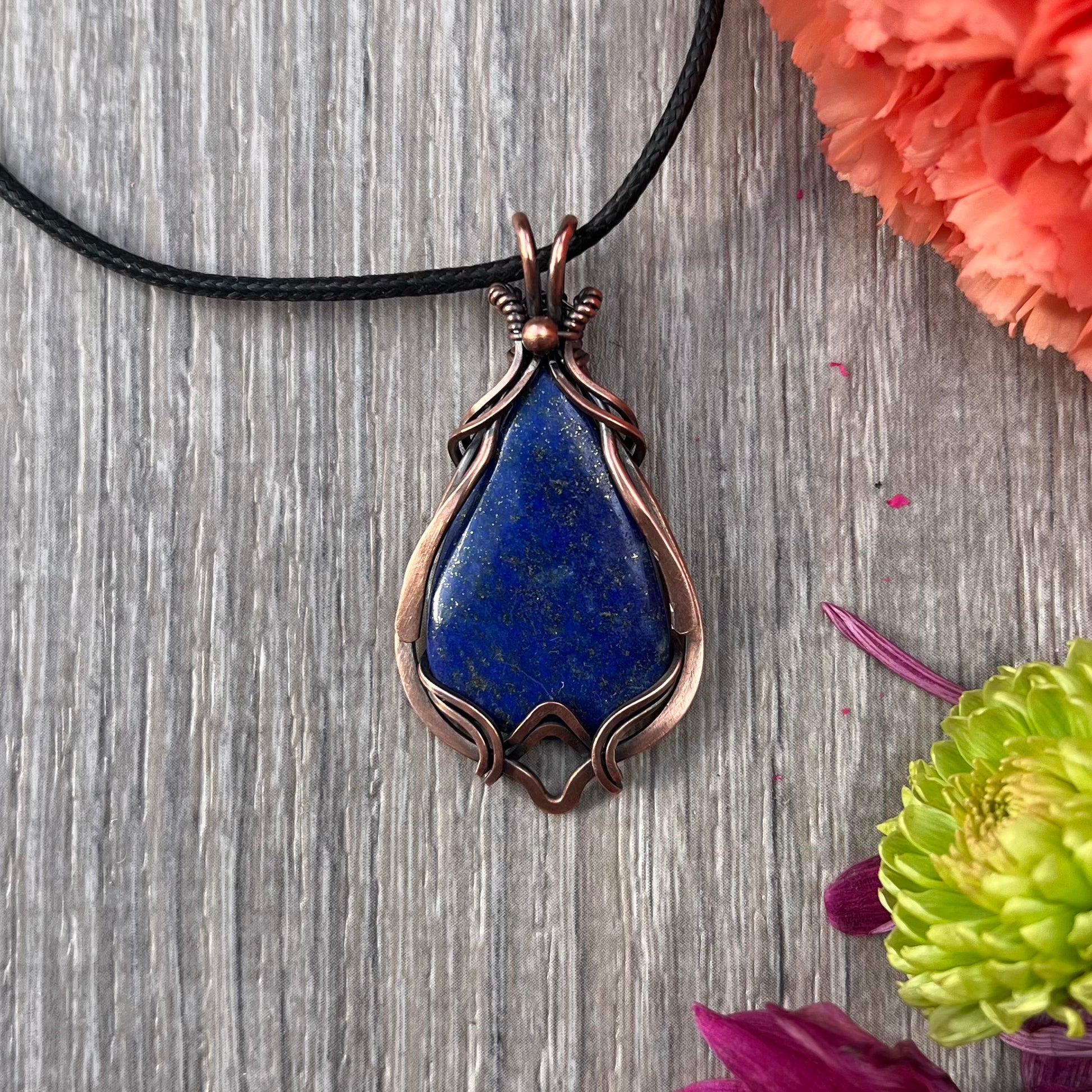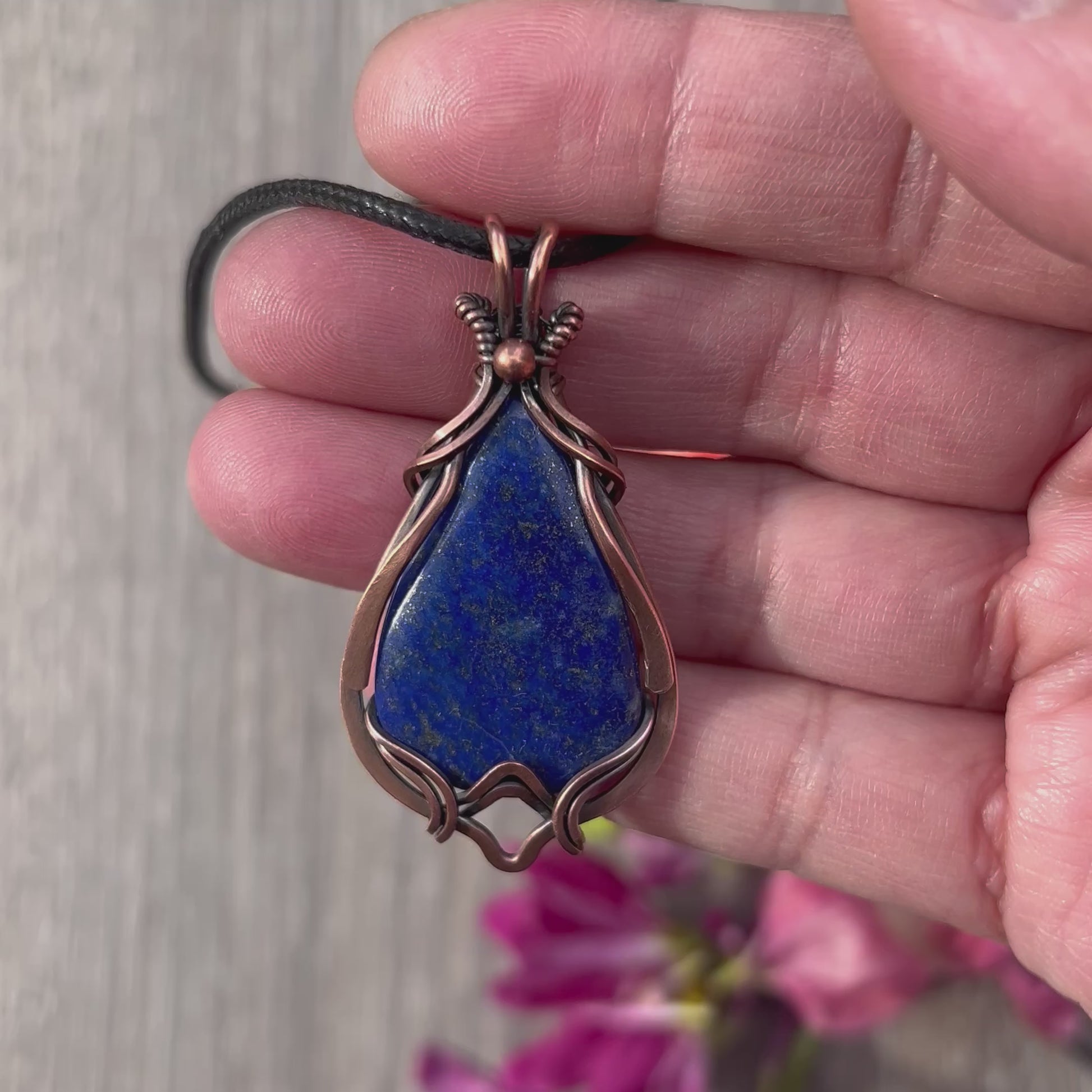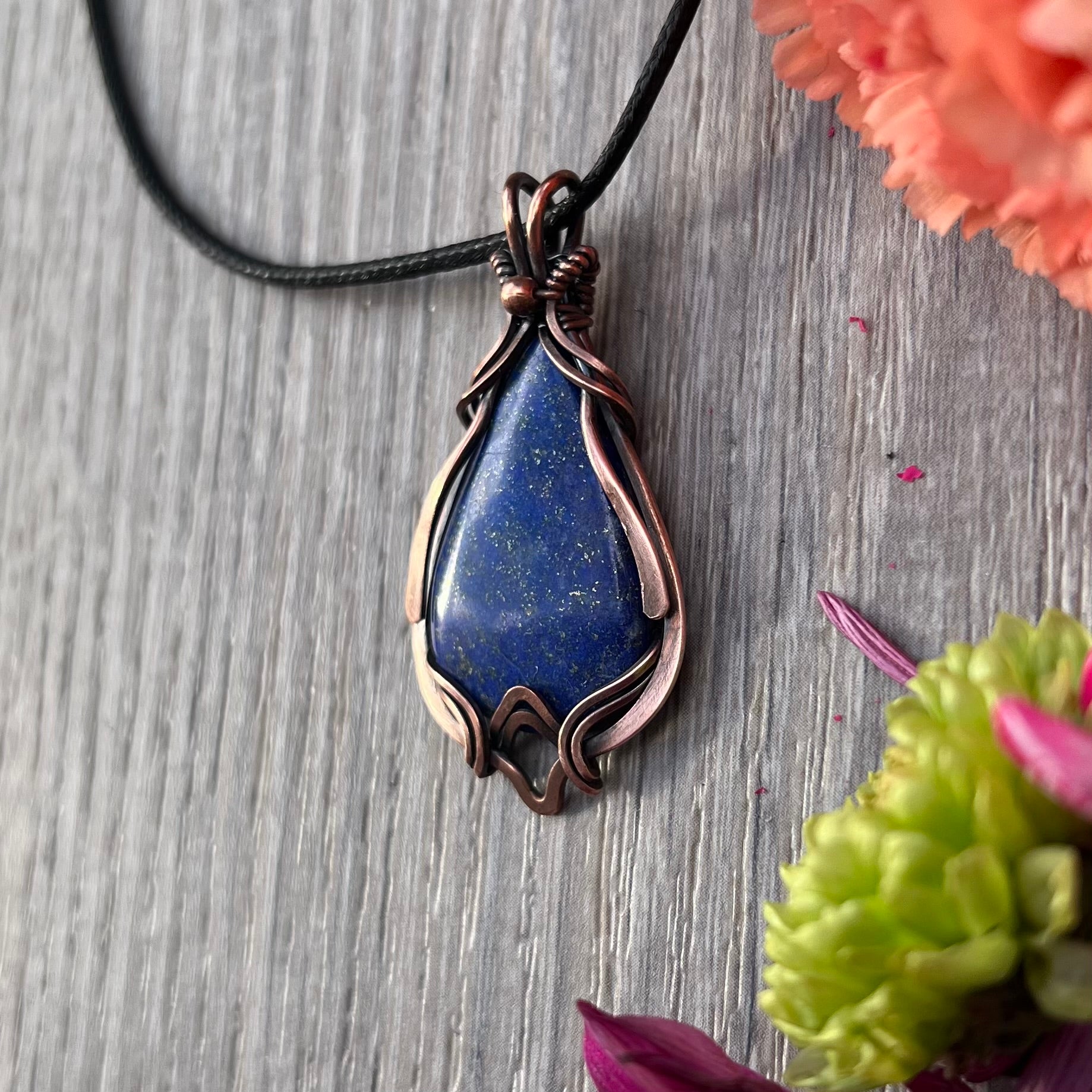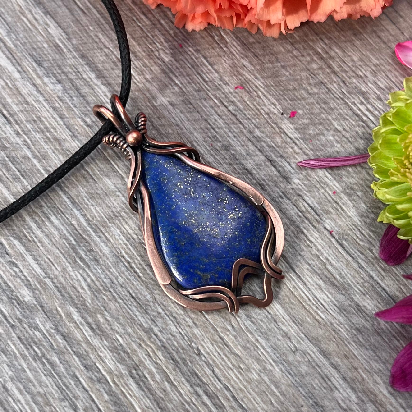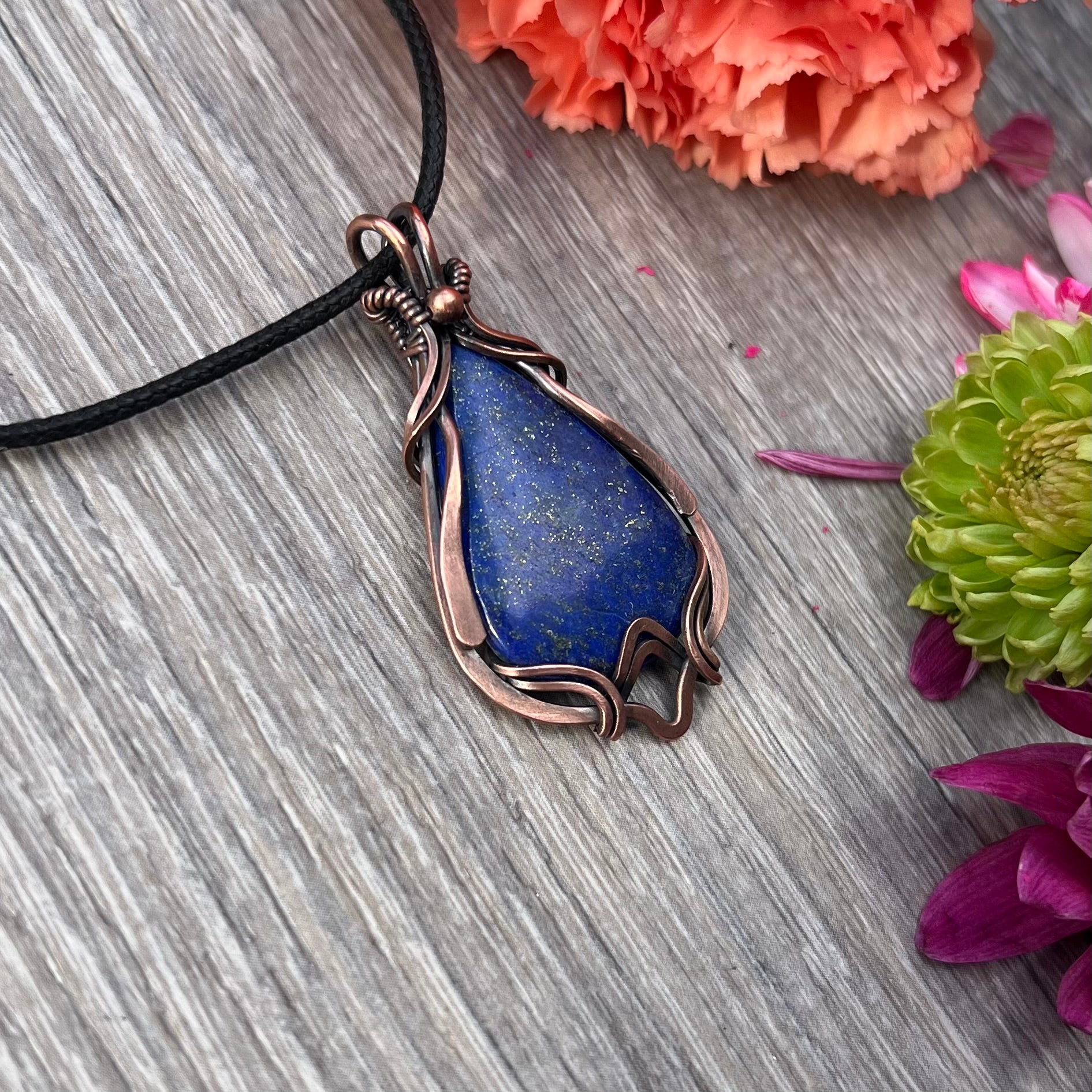A beautiful blue gemstone with gold specks, this Lapis Lazuli is wrapped in antiqued and hammered copper wire.