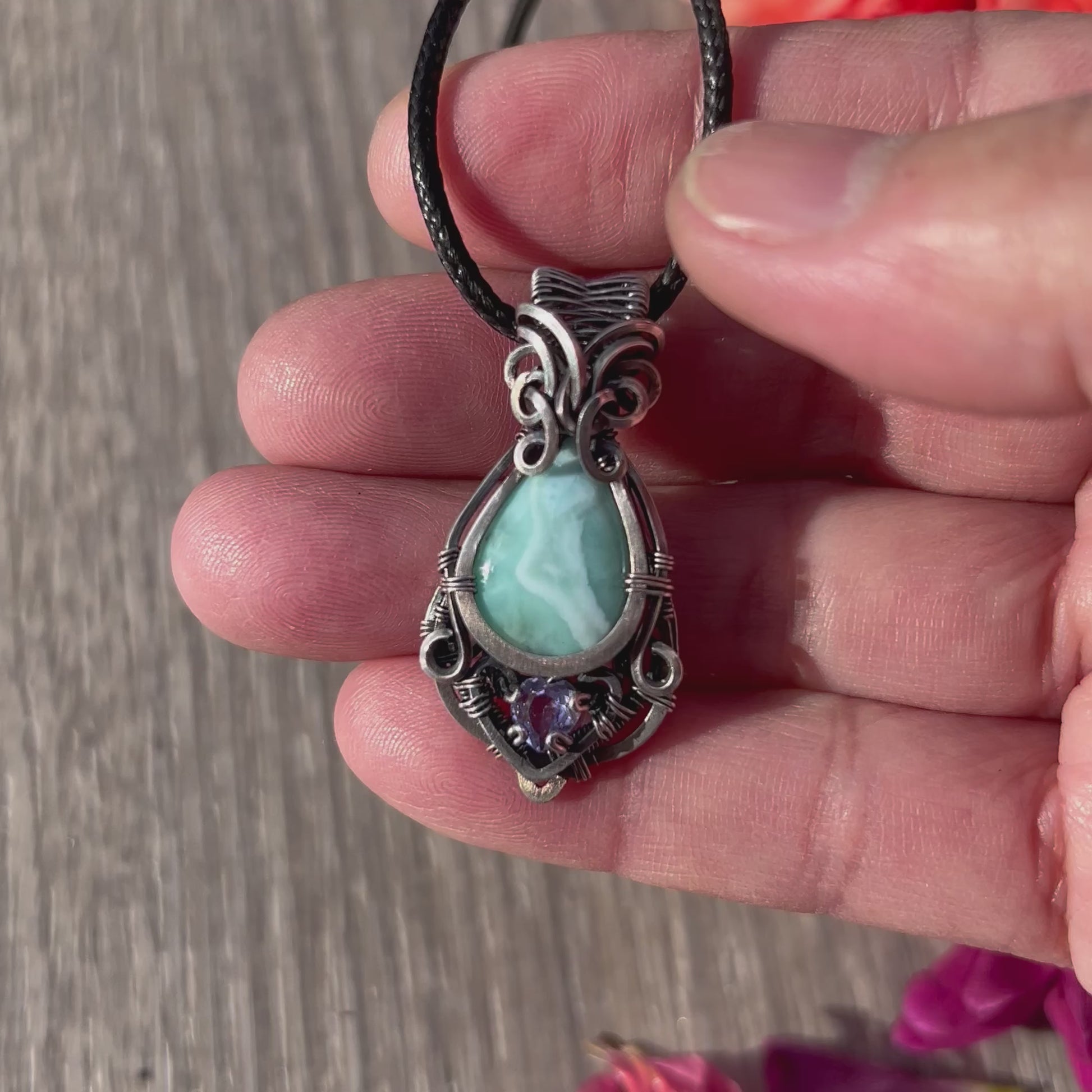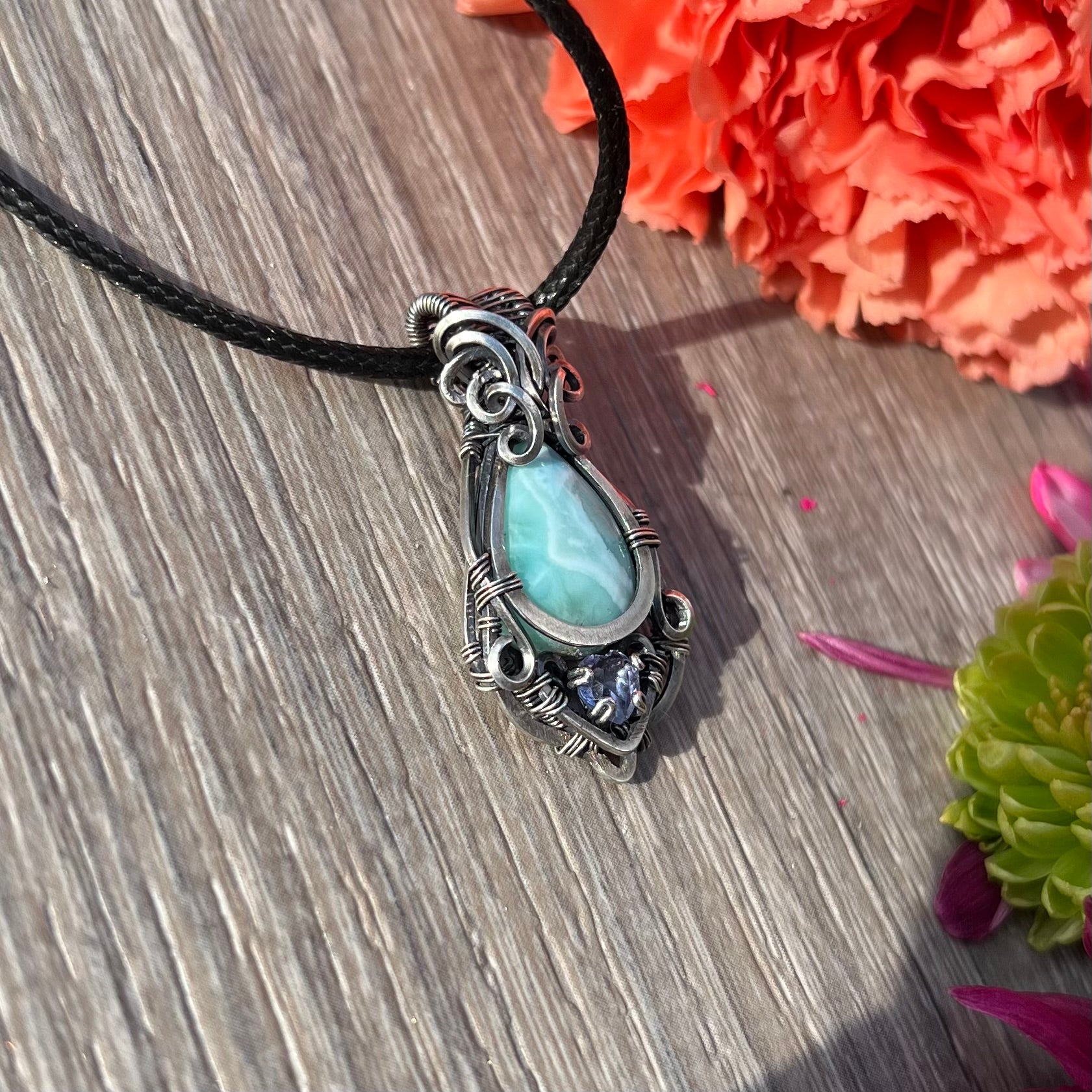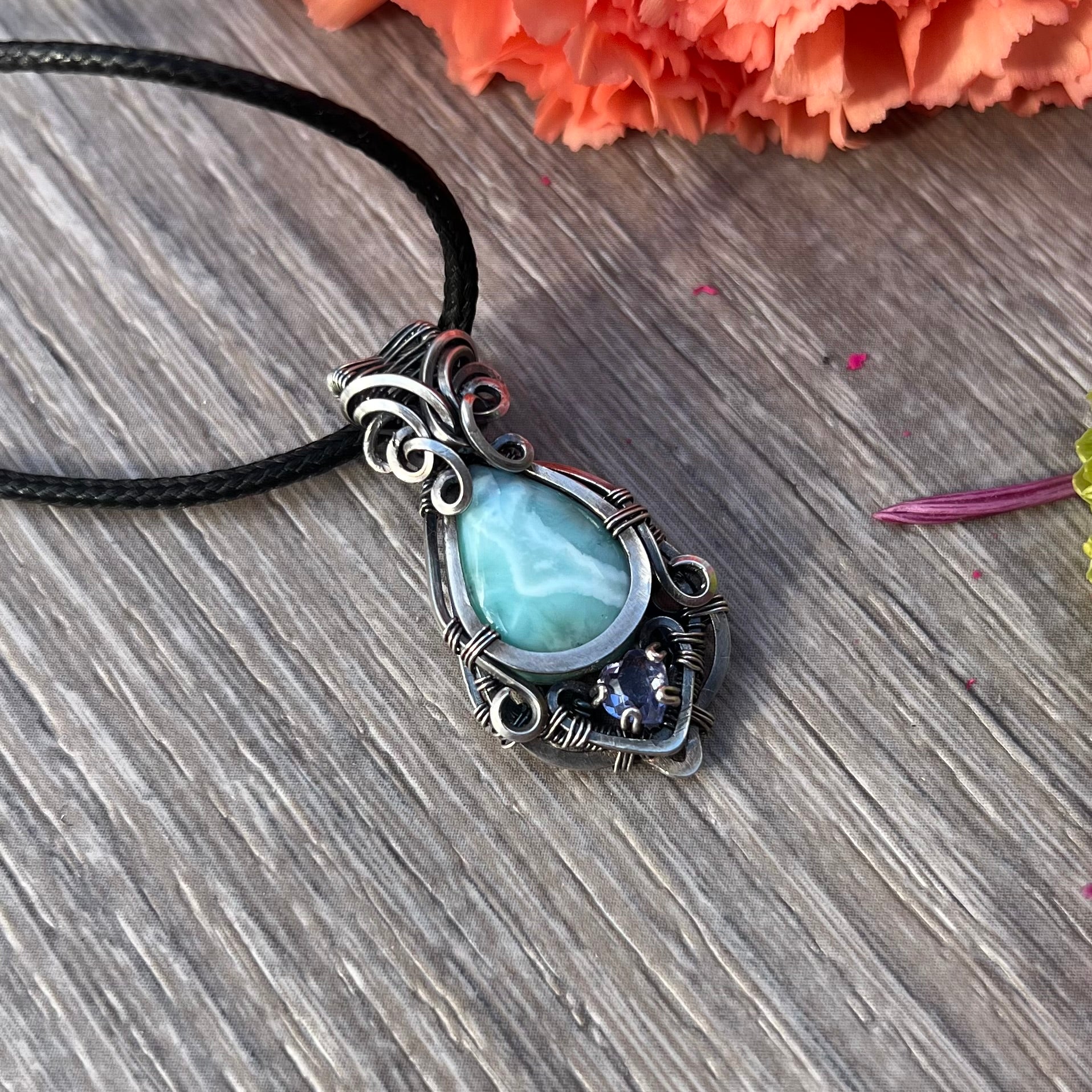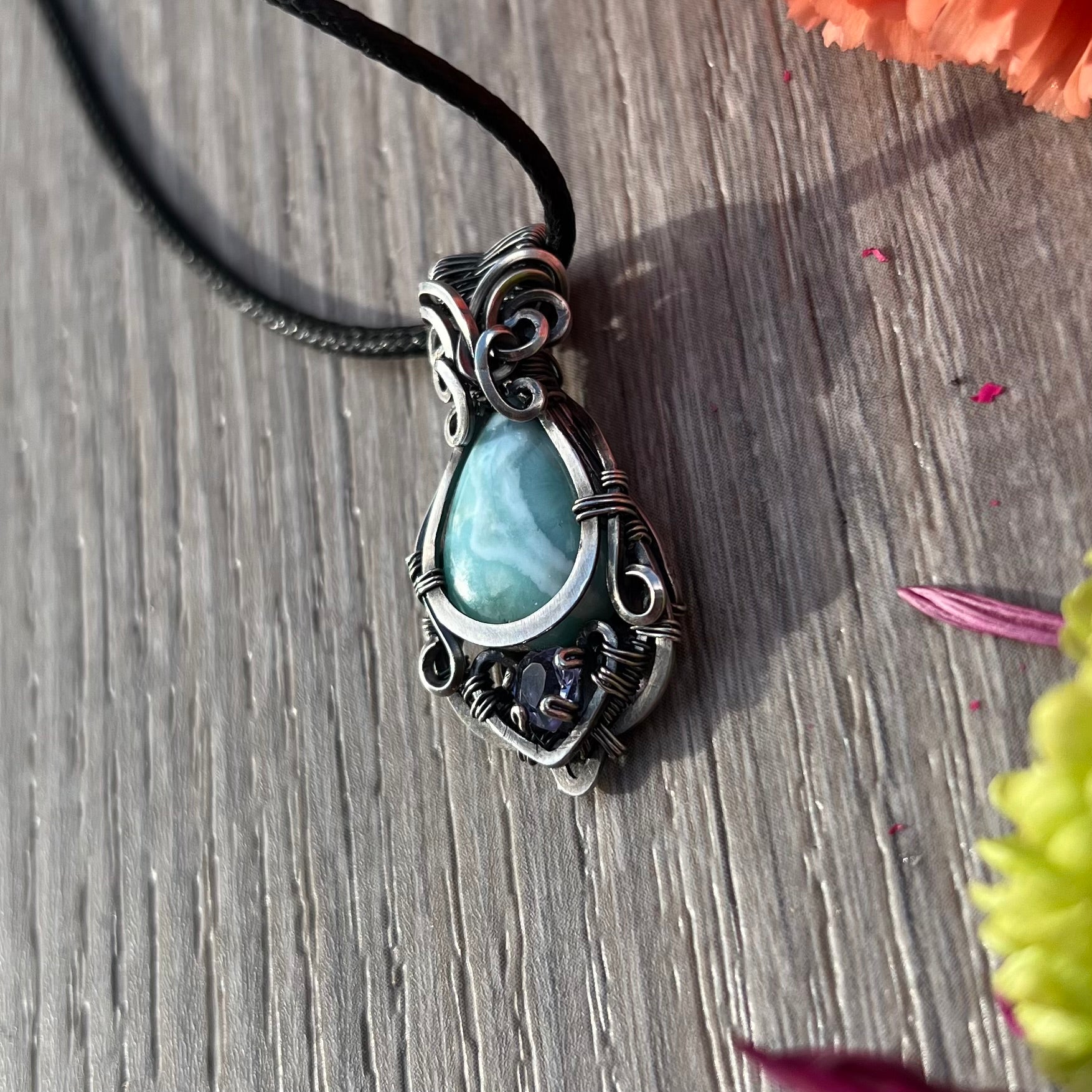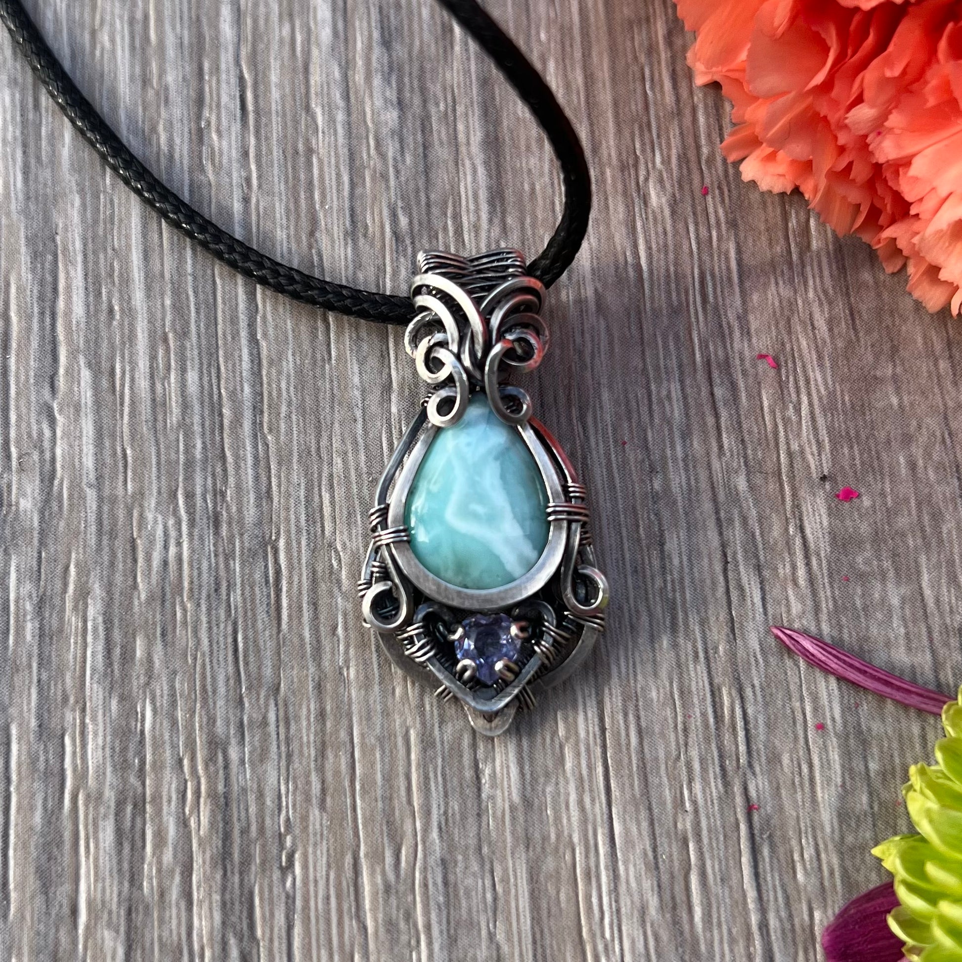 This gorgeous pendant features Larimar with faceted Lavender Alexite wrapped in antiqued Argentium Silver!