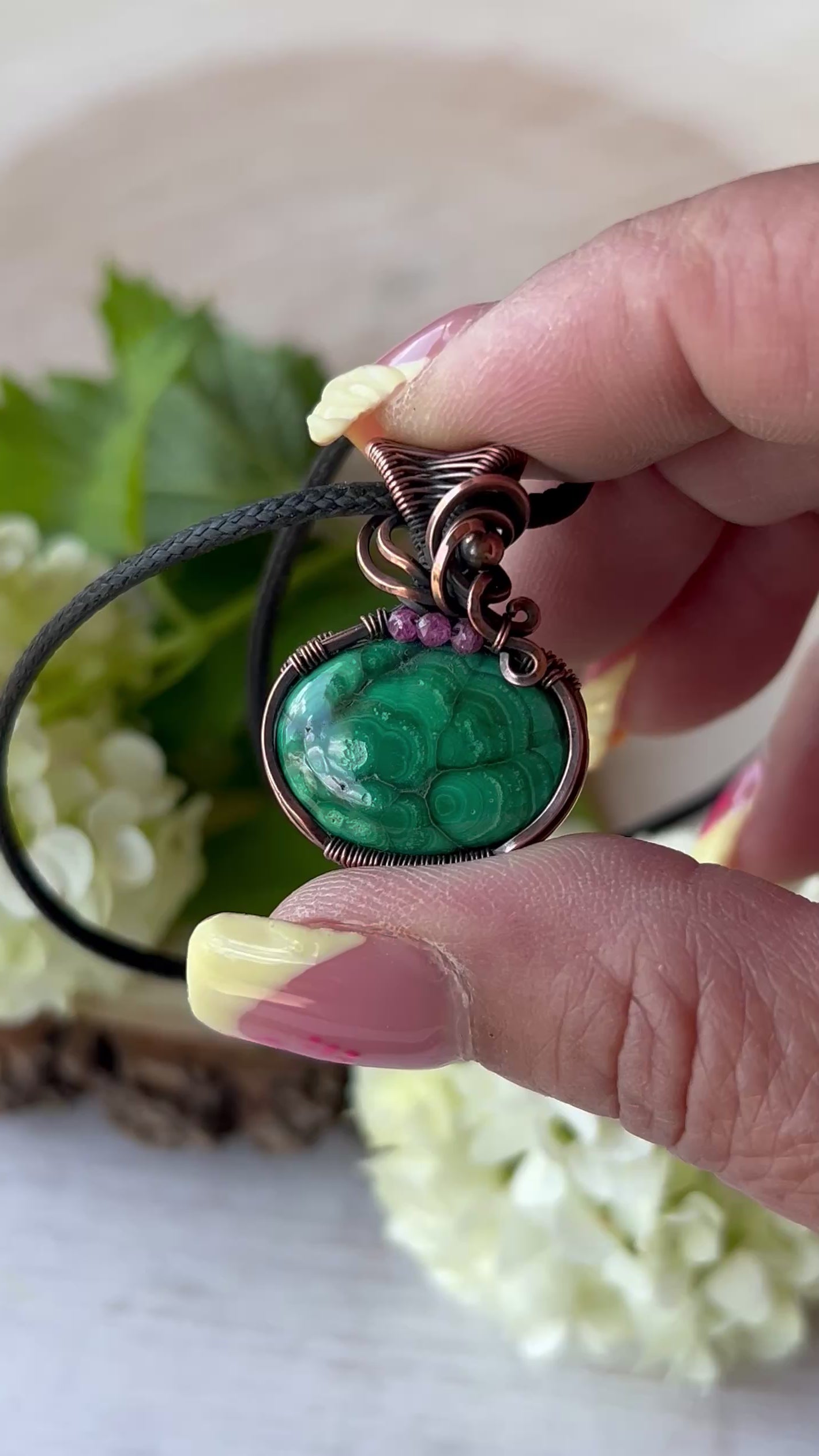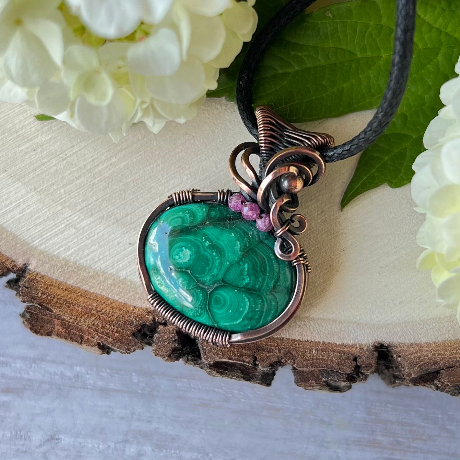 This dainty pendant features a marvelous Malachite wrapped elegantly in antiqued copper wire with faceted ruby beads accent.