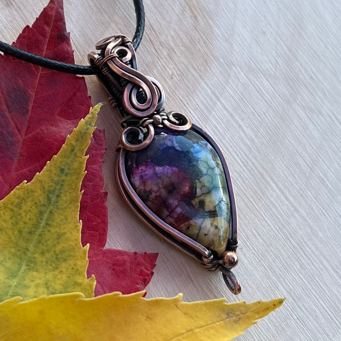 This beautiful pendant features Moss Agate that has been enhanced/dyed with rainbow colors. This piece has been oxidized and hand polished.