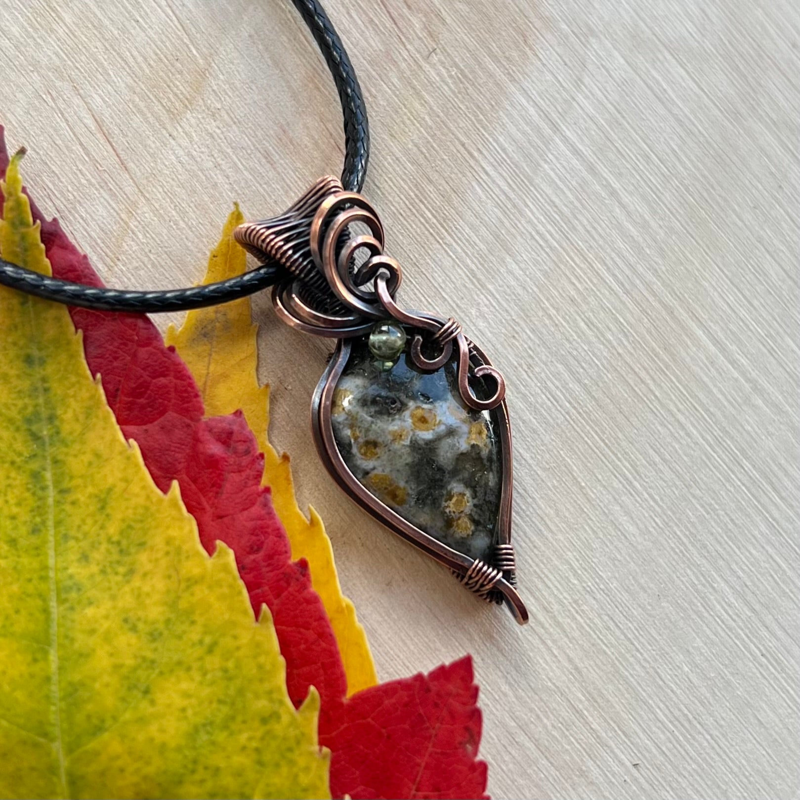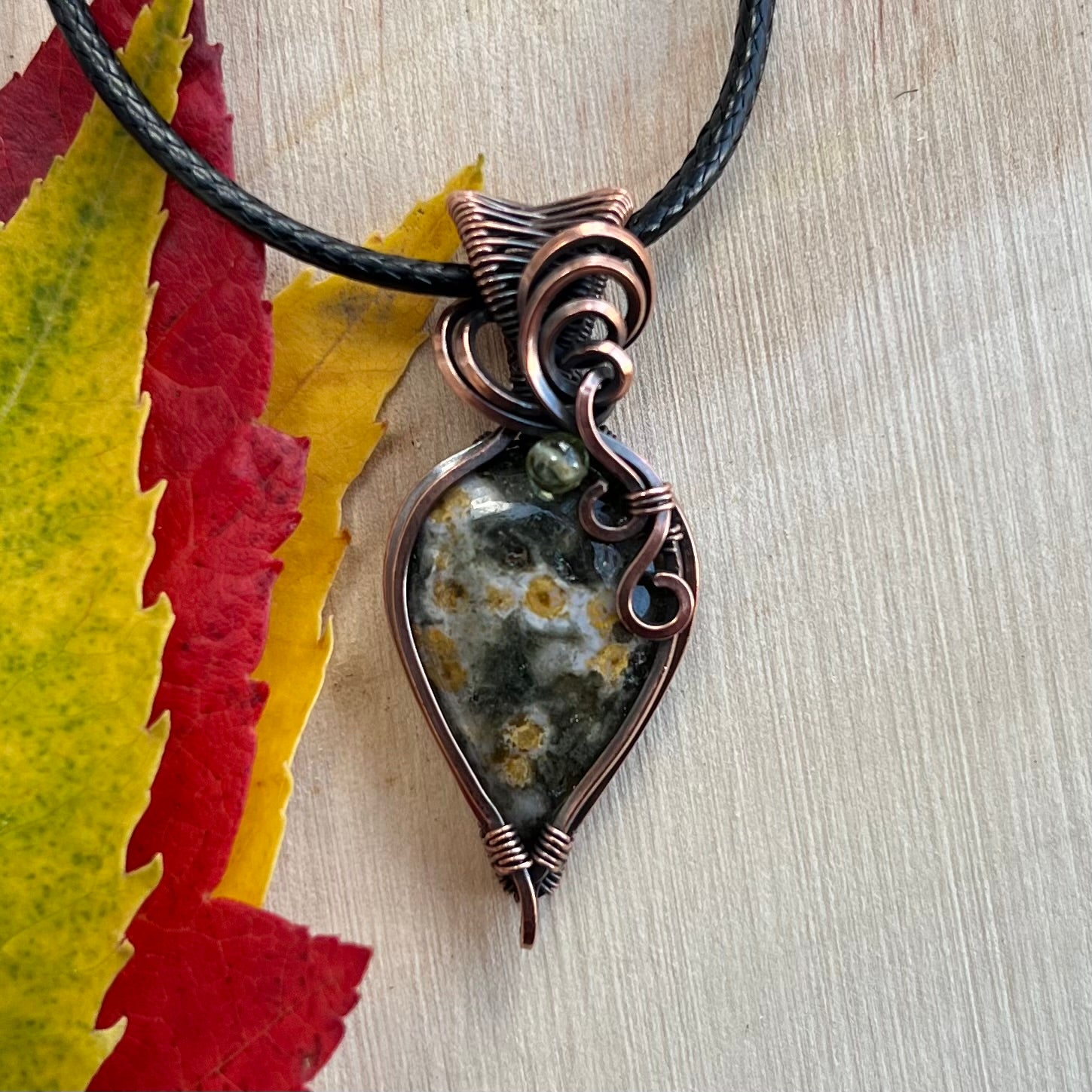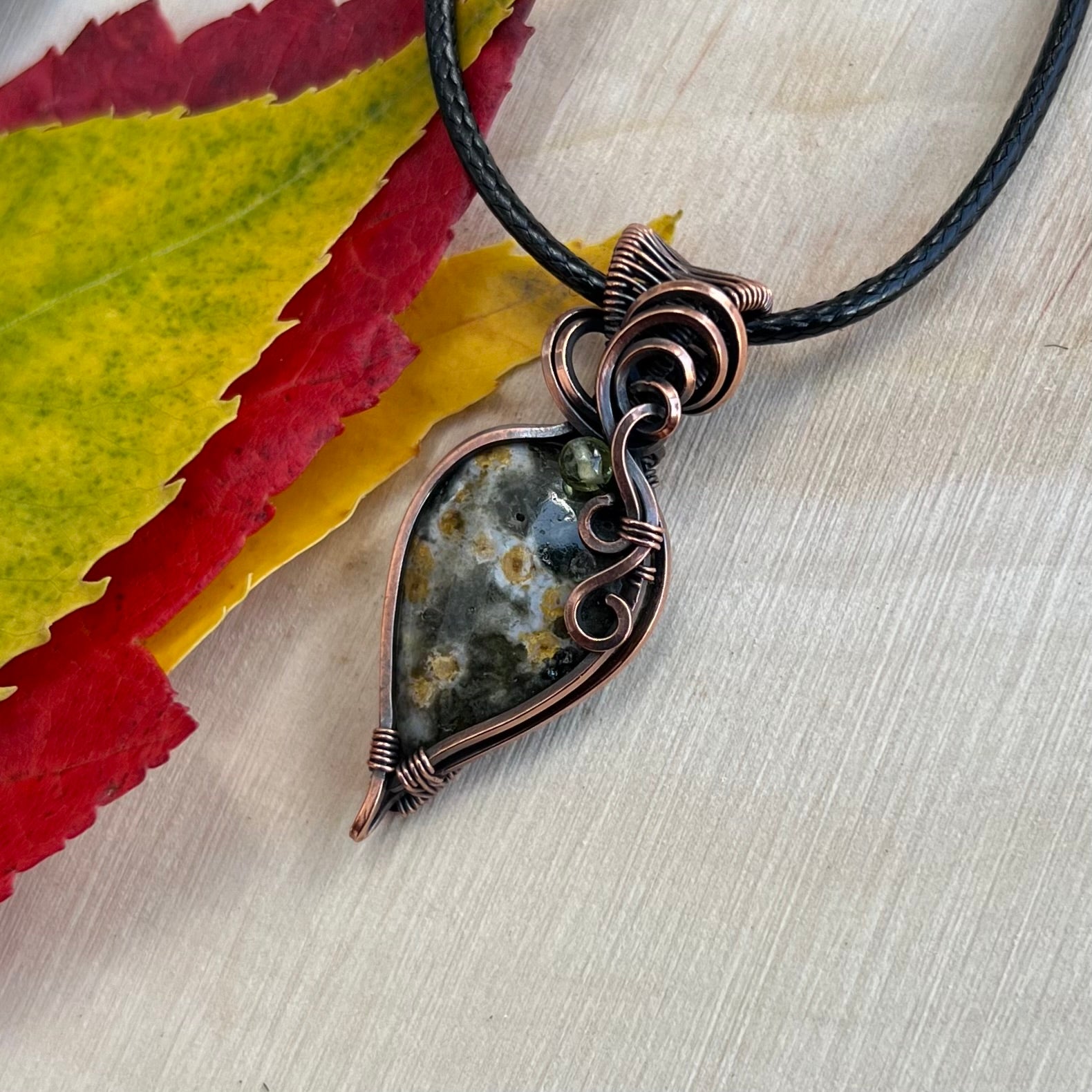 This pendant features a spectacular Ocean Jasper with Peridot, wrapped elegantly in antiqued Copper wire.