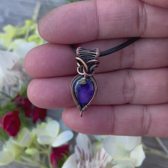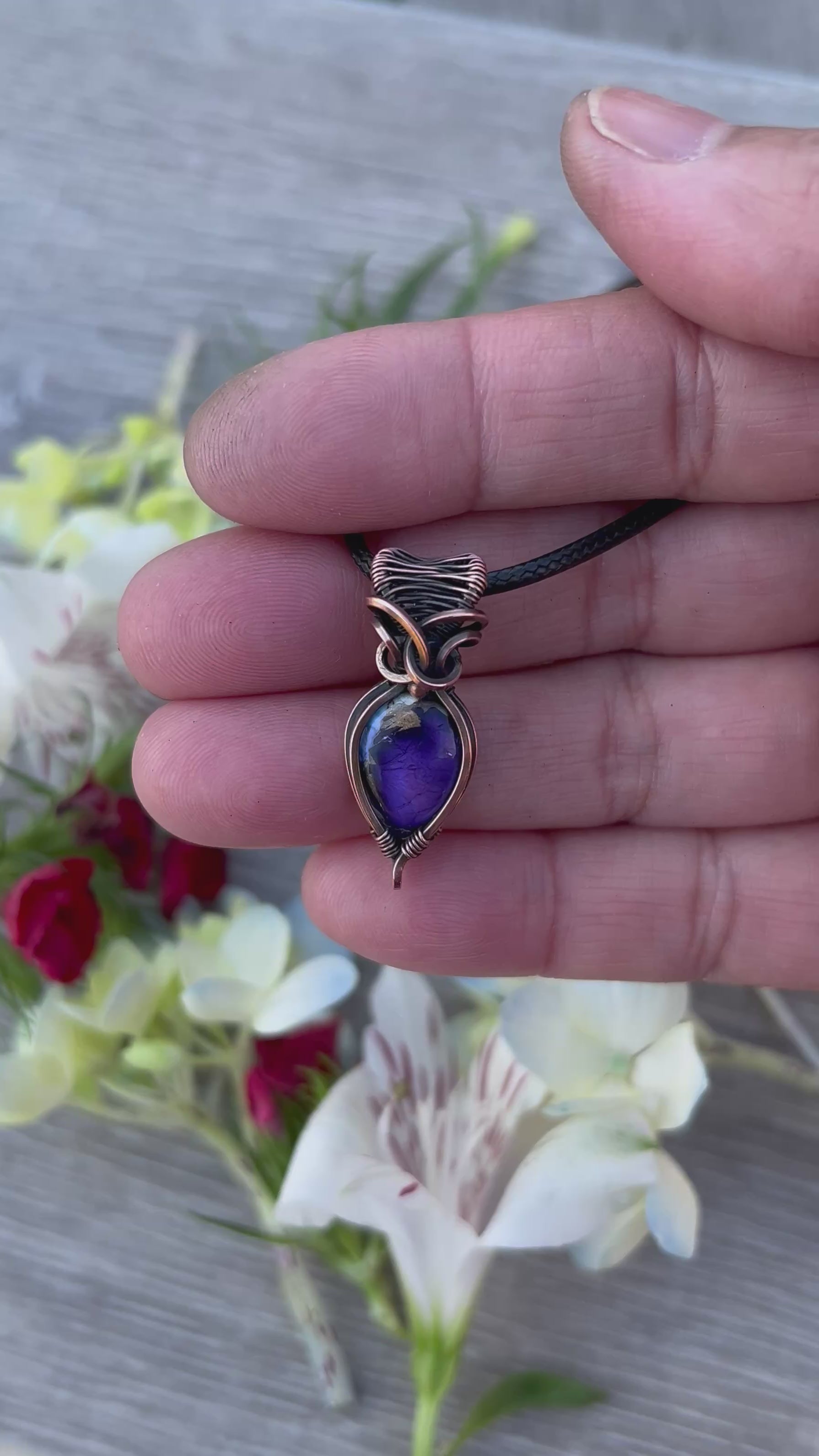 This beautiful pendant features Purple Rose Dahlia wrapped in antiqued copper. This is a manmade stone using natural turquoise that is color-enhanced and made into a matrix with copper.