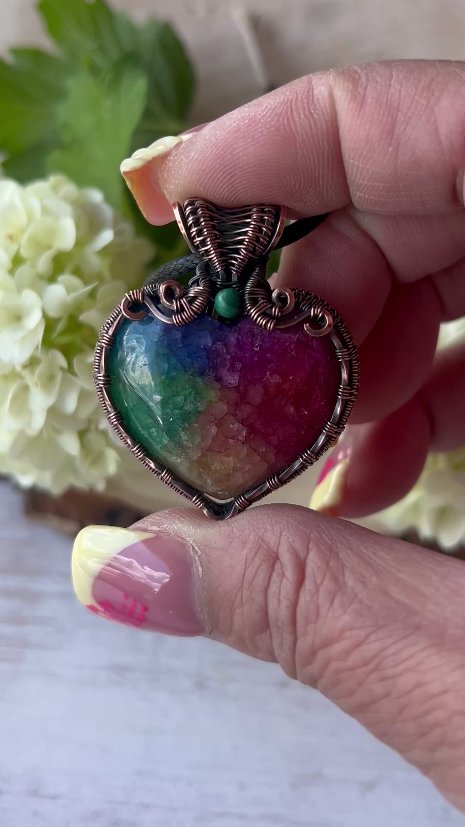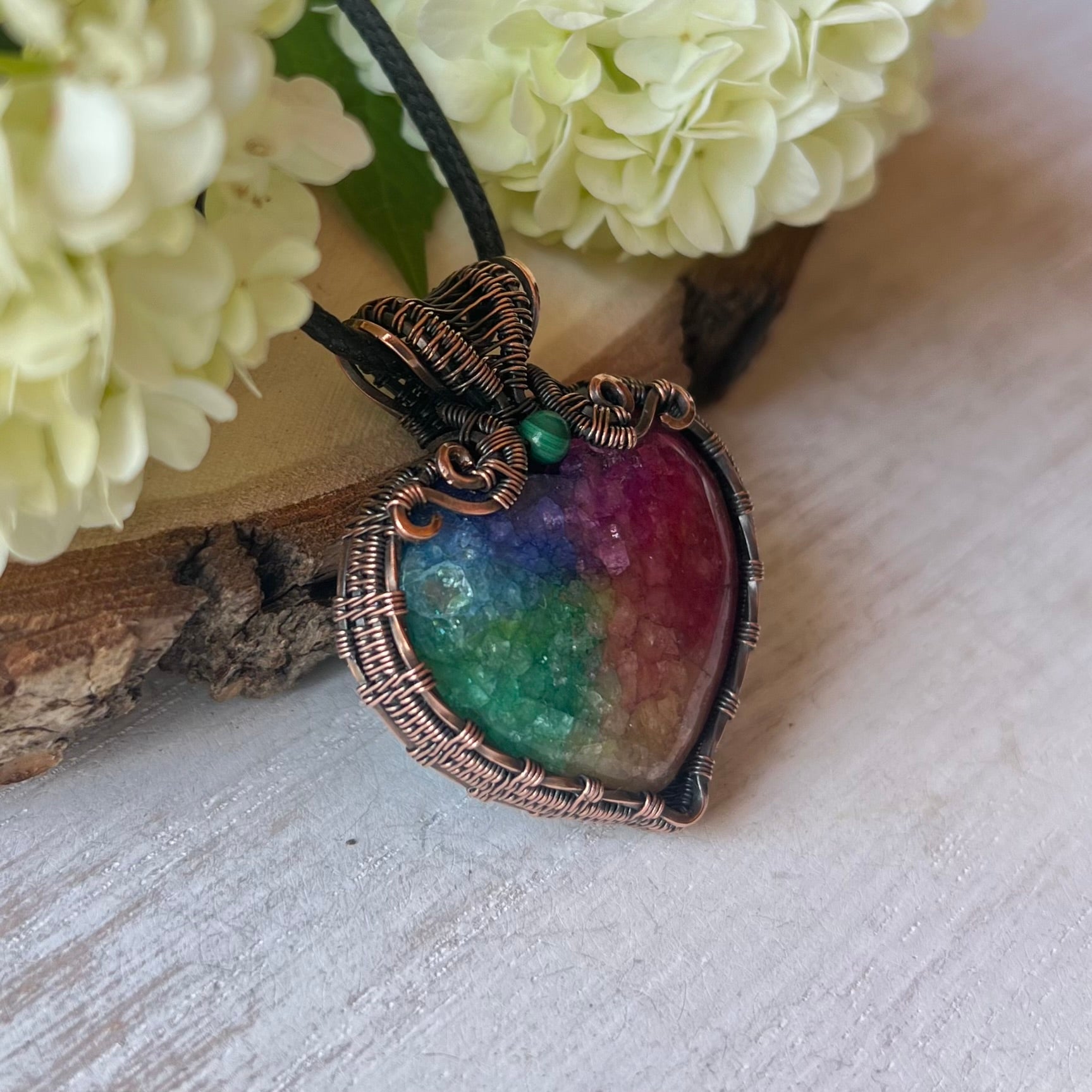 Rainbow (enhanced) Quartz heart with Malachite bead in antiqued Copper Wire