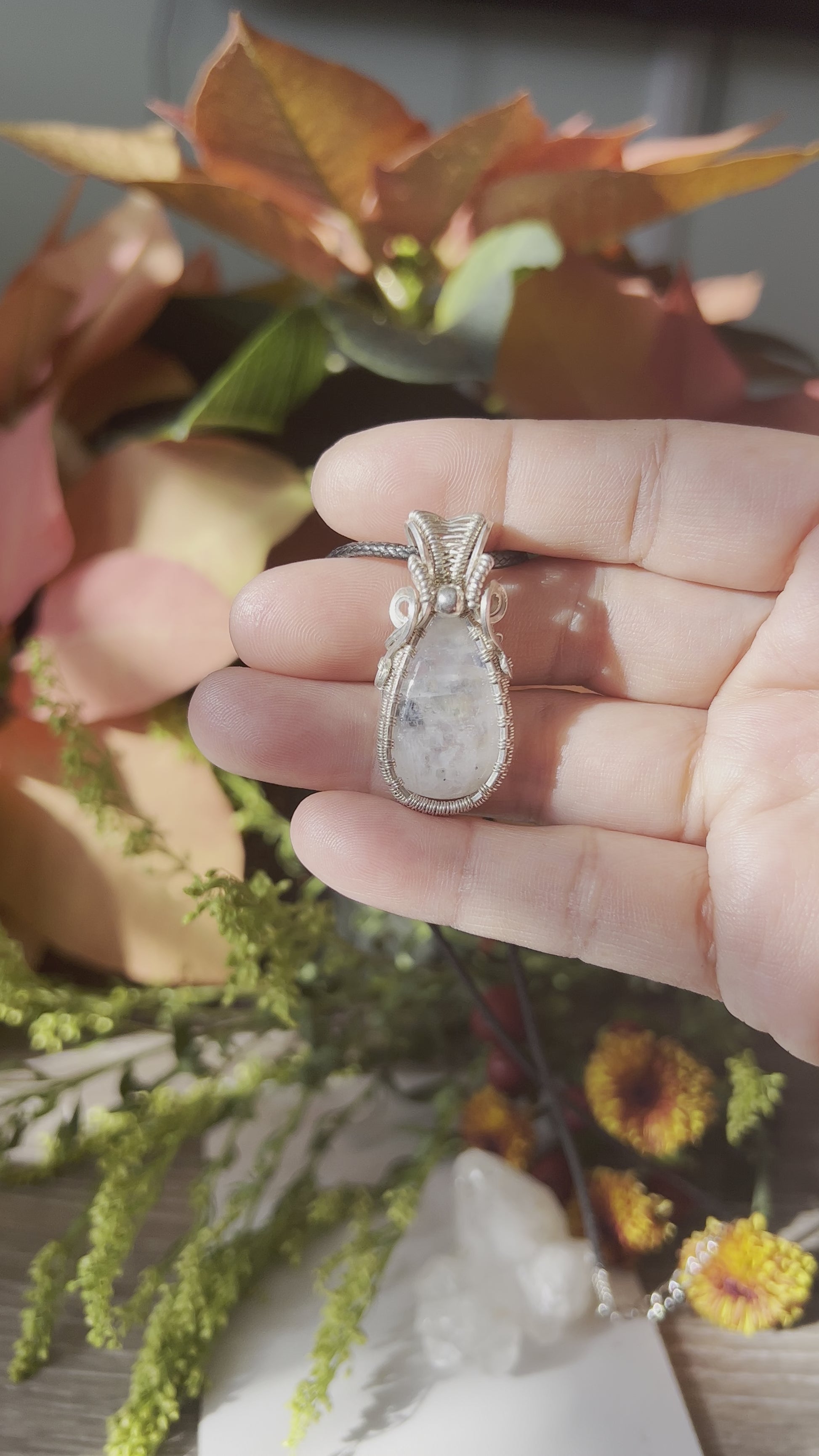 Gorgeous pendant featuring Rainbow Moonstone with Tourmaline. It is set in Argentium Silver.