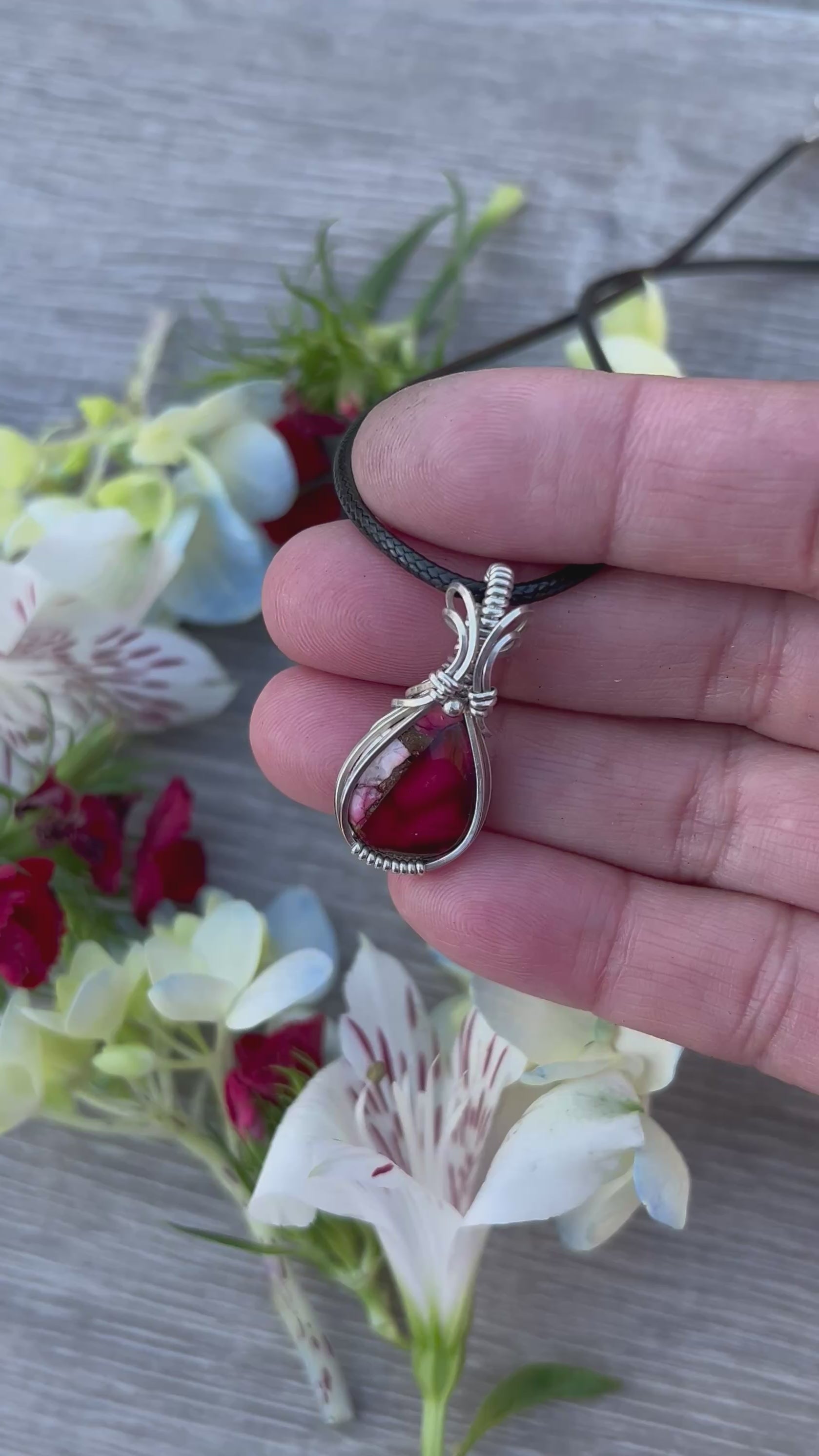 This elegant pendant features Red Rose Dahlia wrapped in Argentium Silver. This is a manmade stone using natural turquoise that is color-enhanced and made into a matrix with copper.