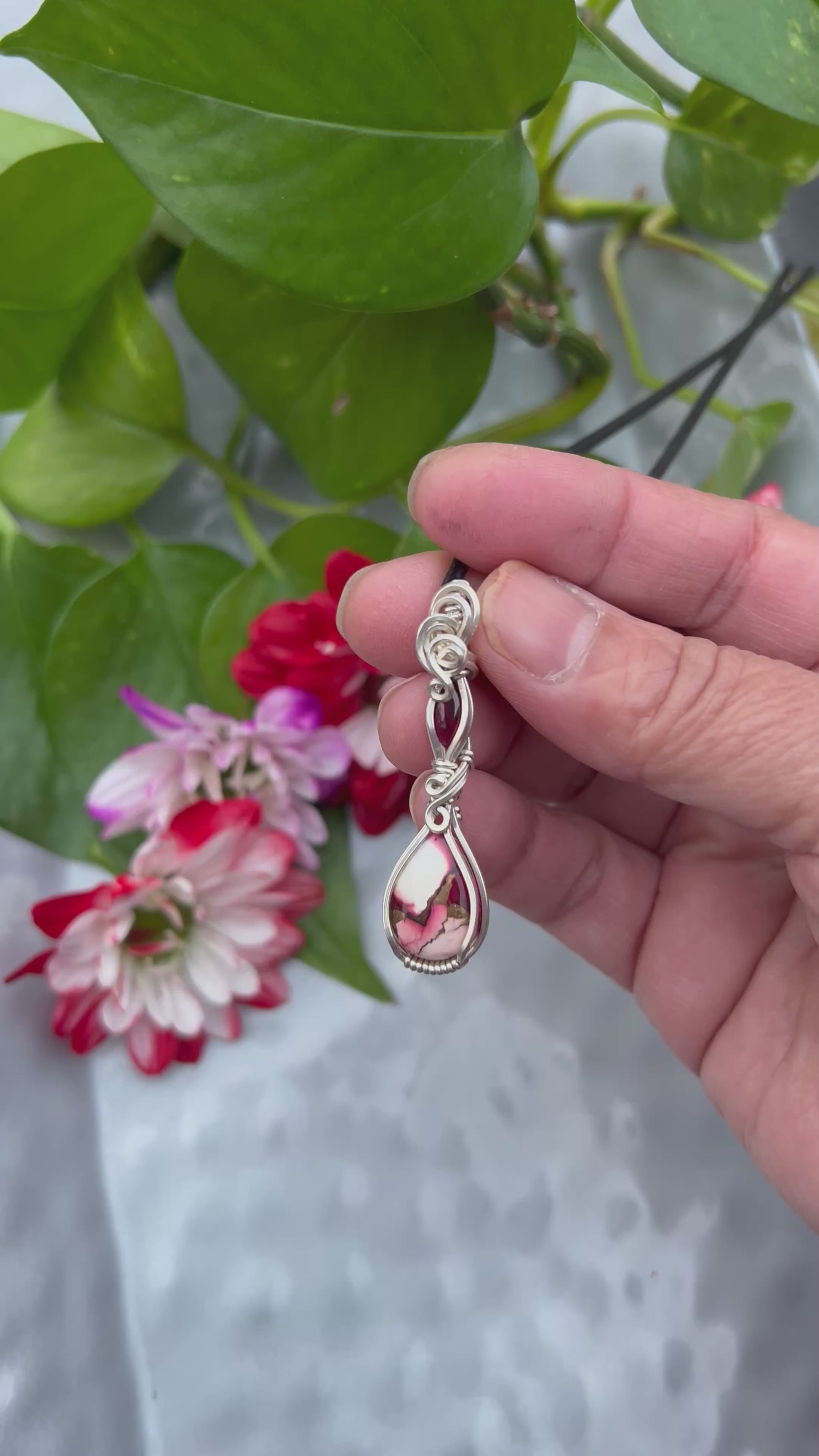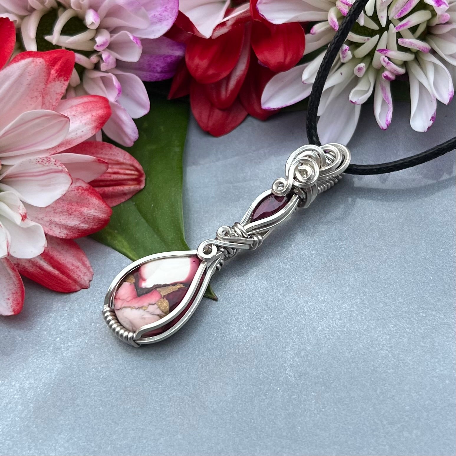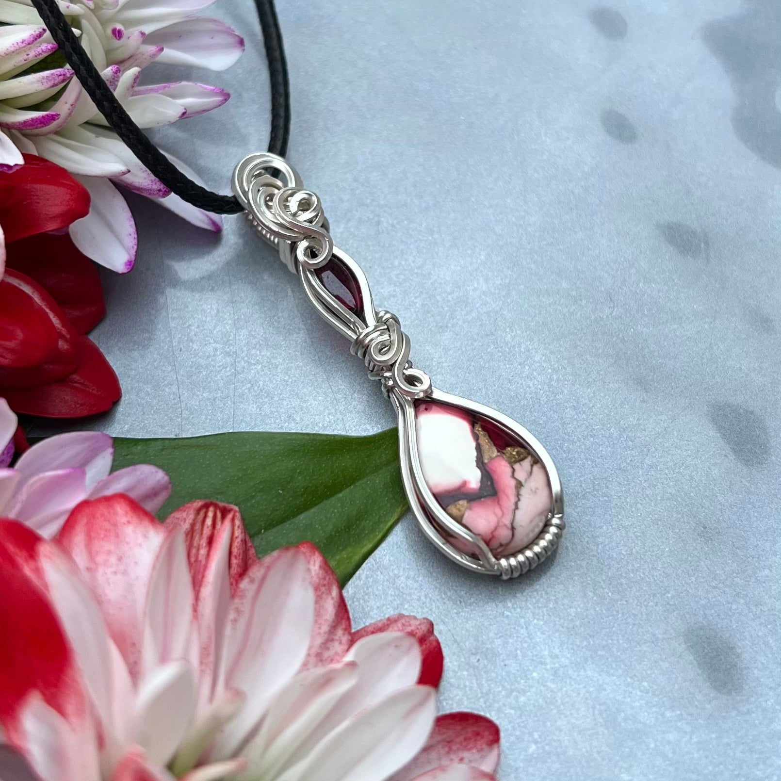 This beautiful slim and long pendant features Red Rose Dahlia and Garnet, wrapped in Argentium Silver wire which has a higher silver content than Sterling Silver, is tarnish resistant and hypoallergenic.