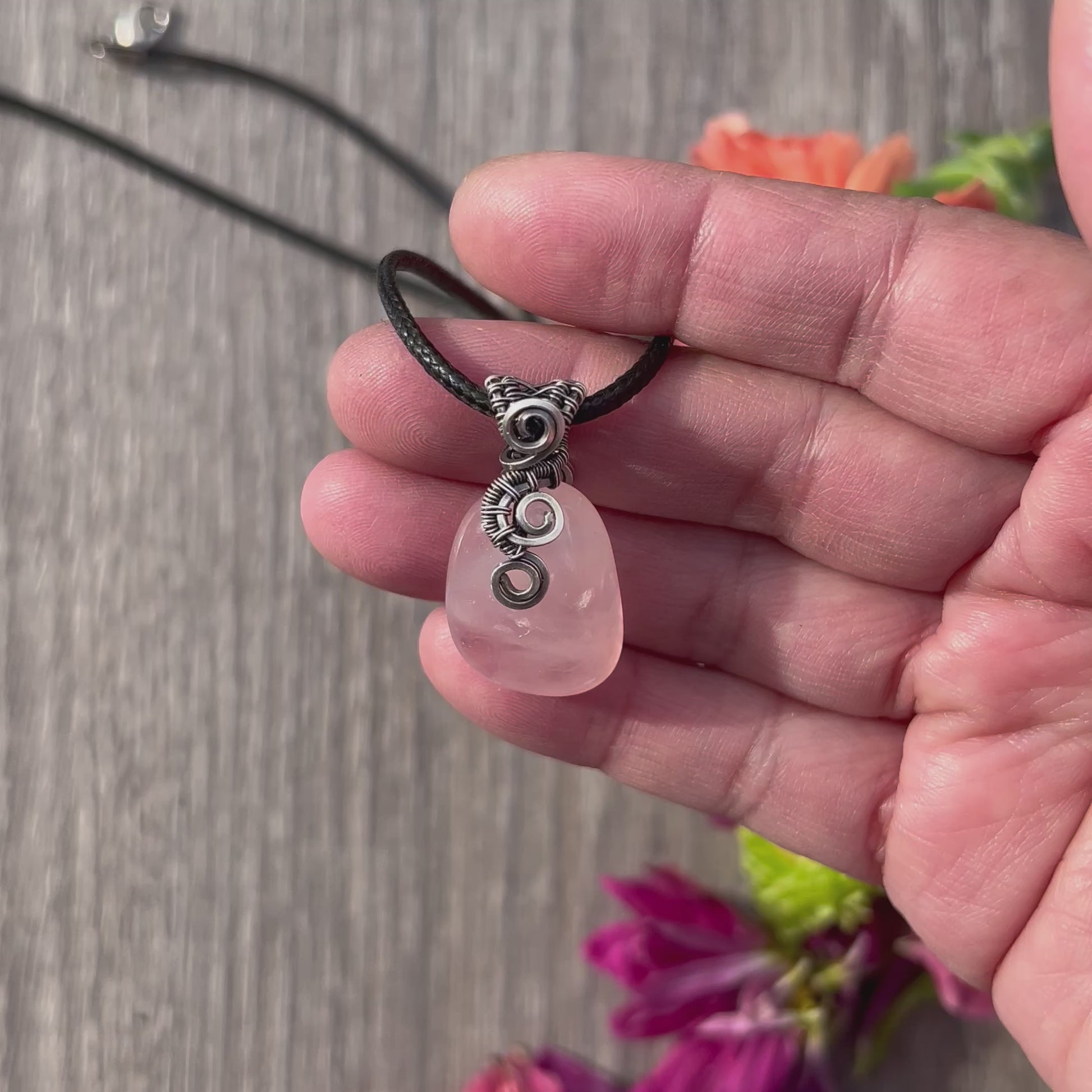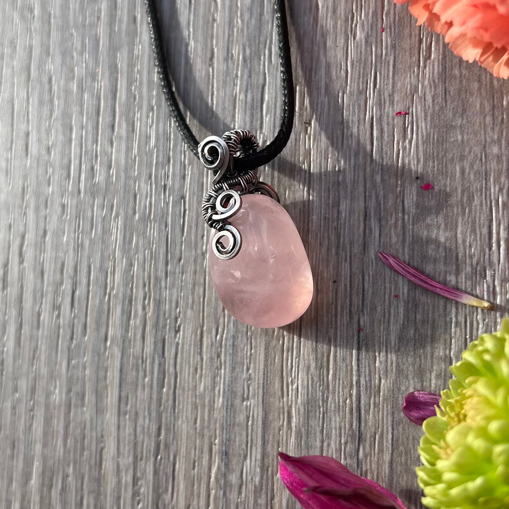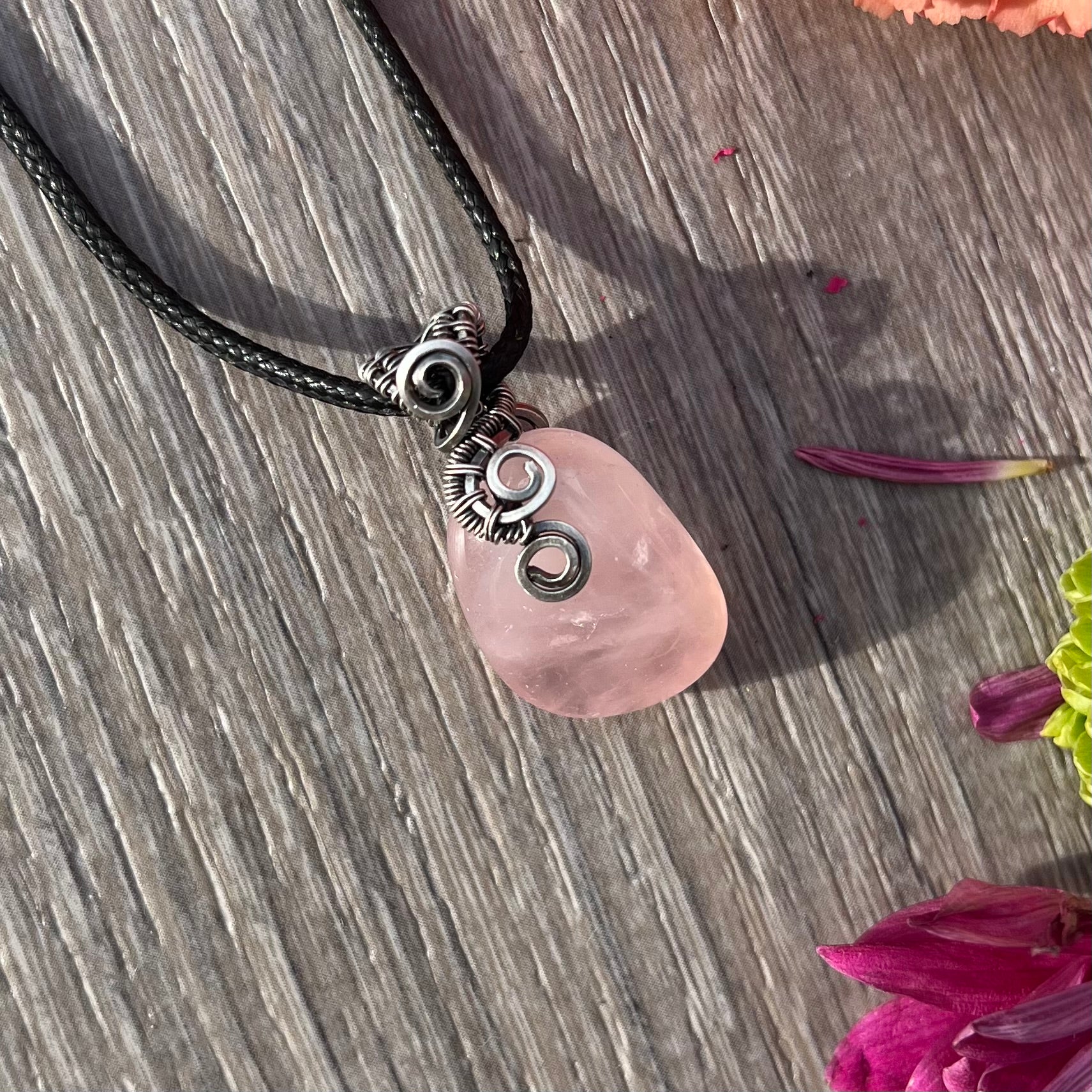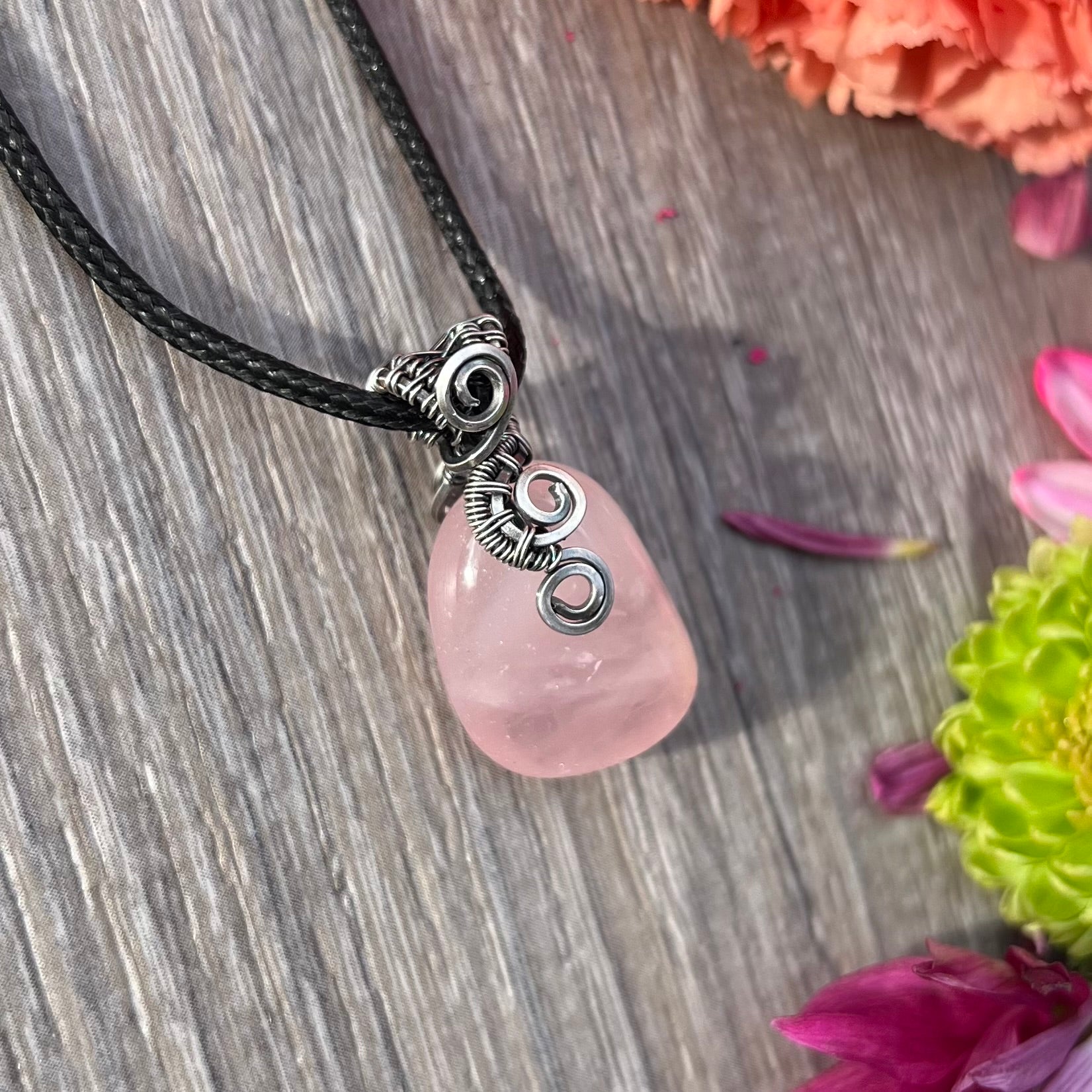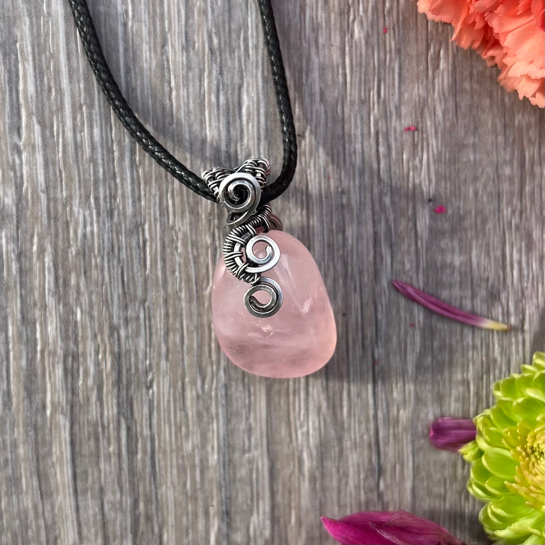 This pendant features a beautiful tumbled and drilled Rose Quartz with Argentium Silver bail.