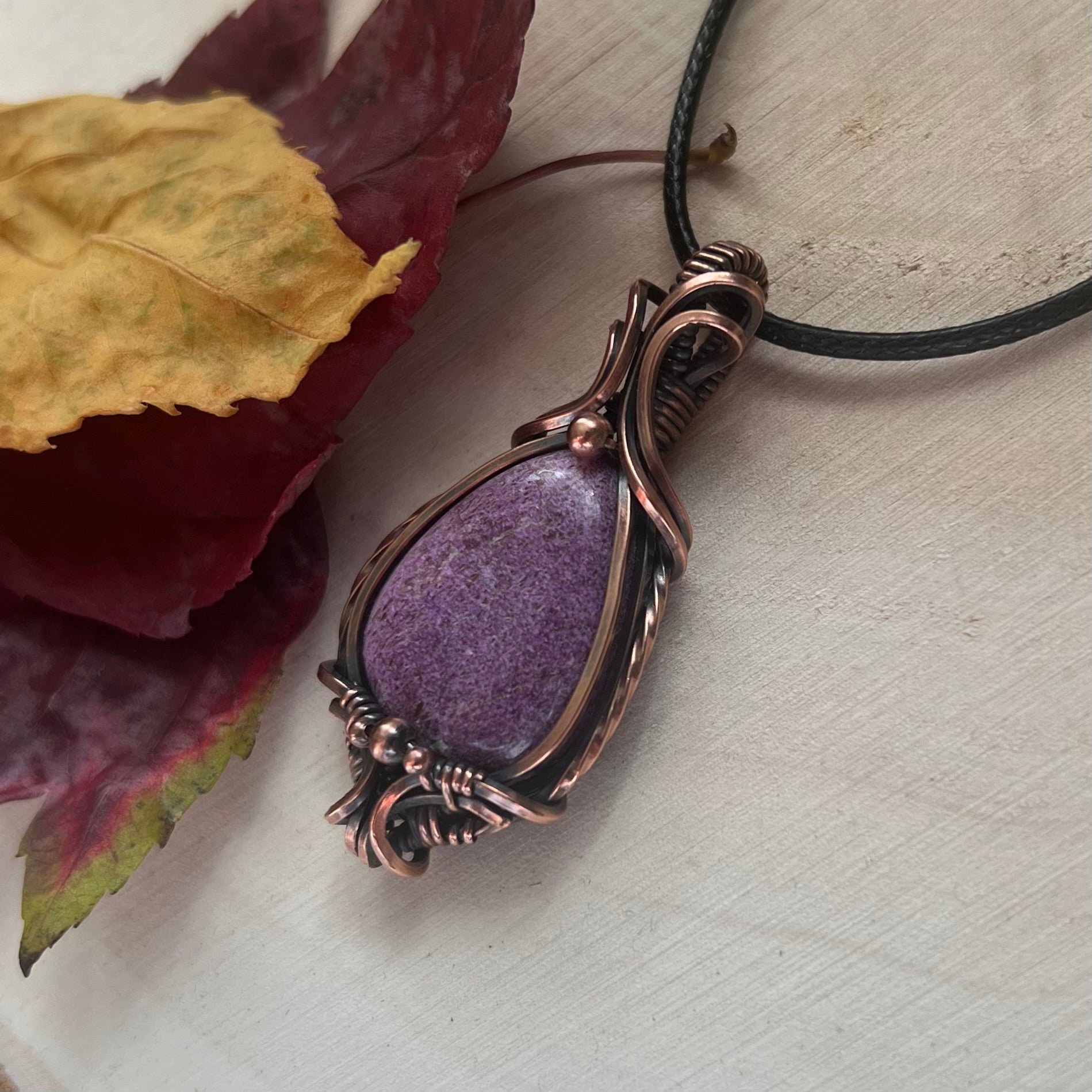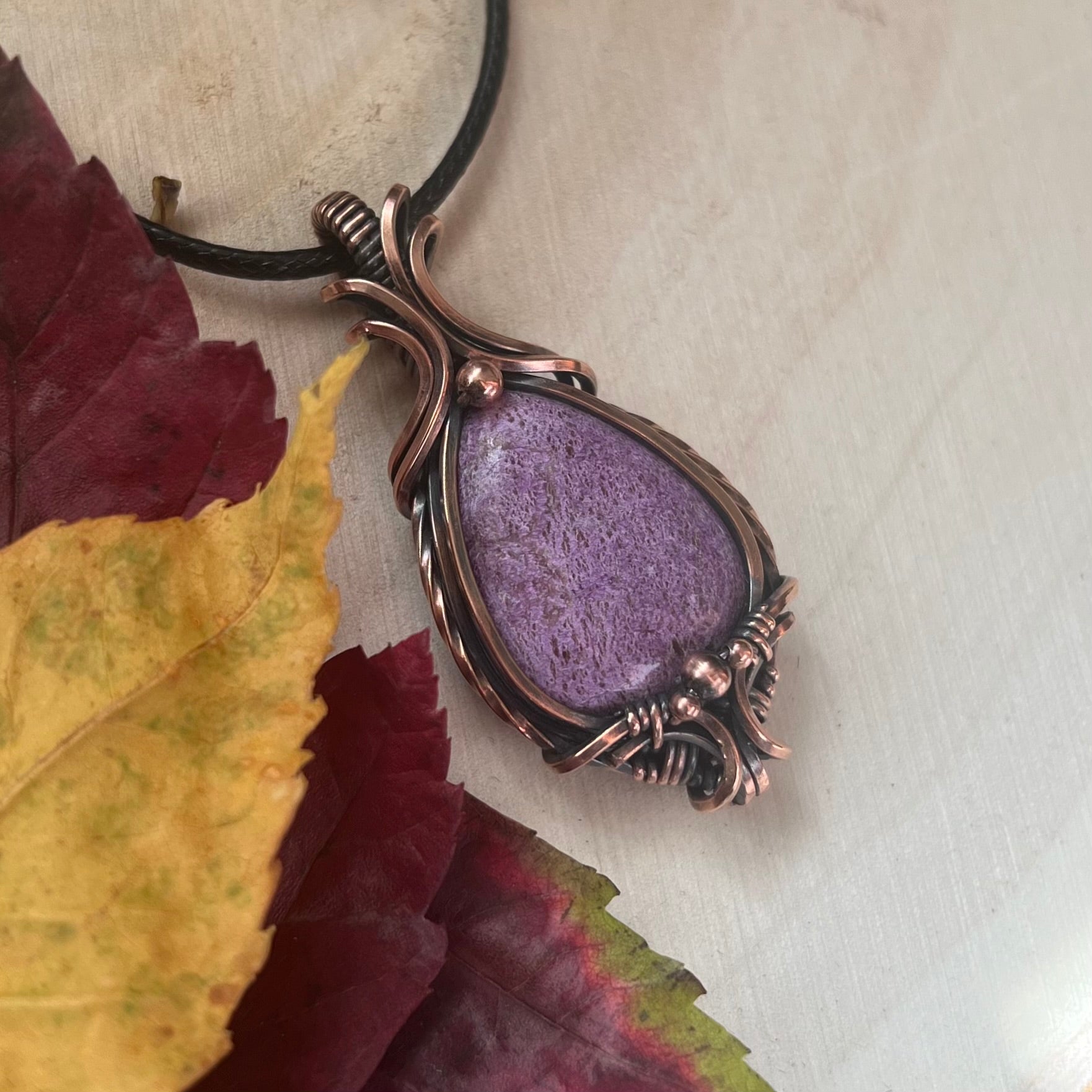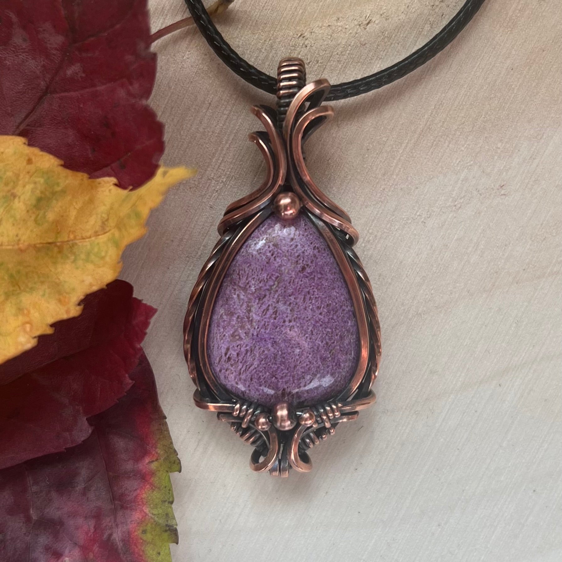 This gorgeous pendant features Stichtite, wrapped elegantly in oxidized copper wire.