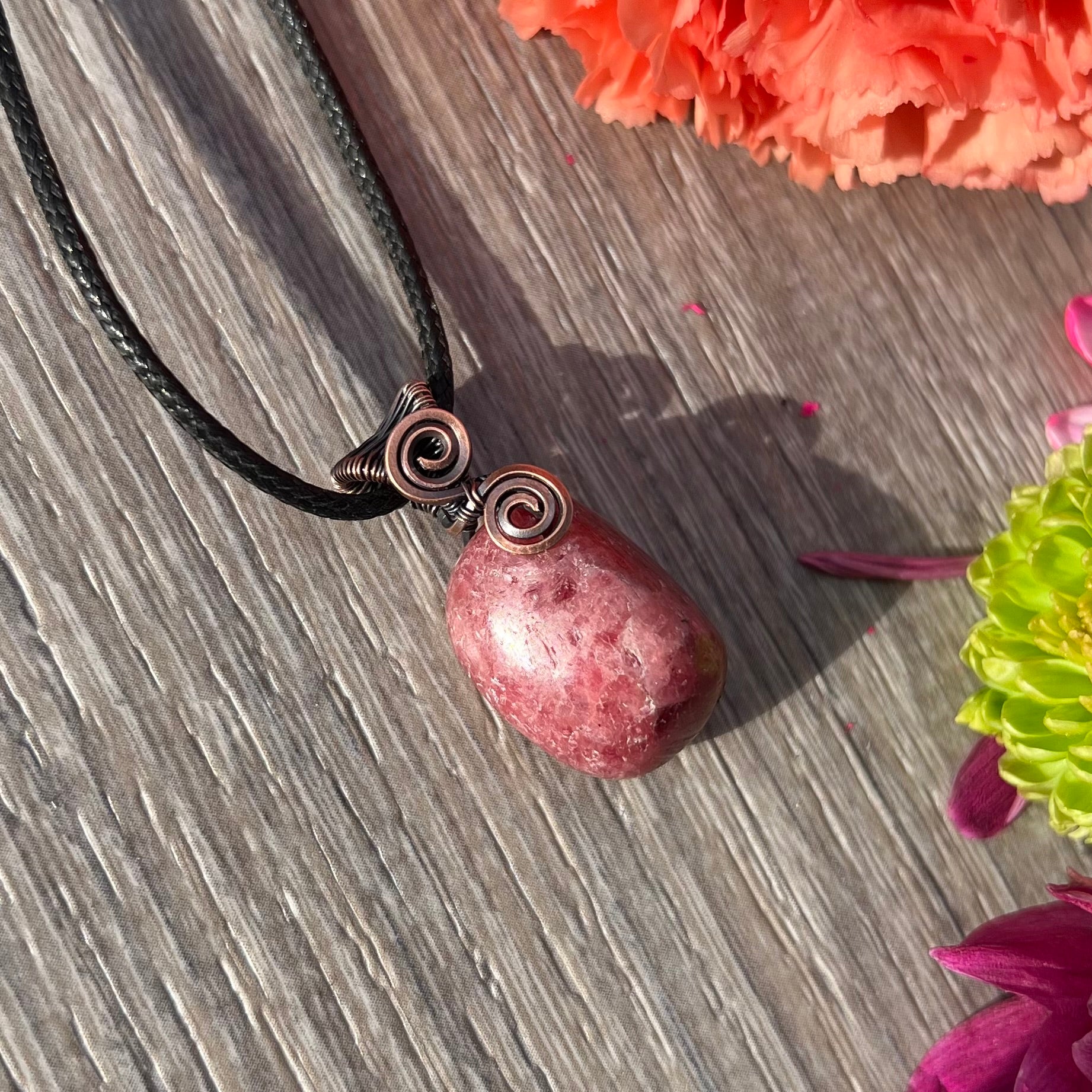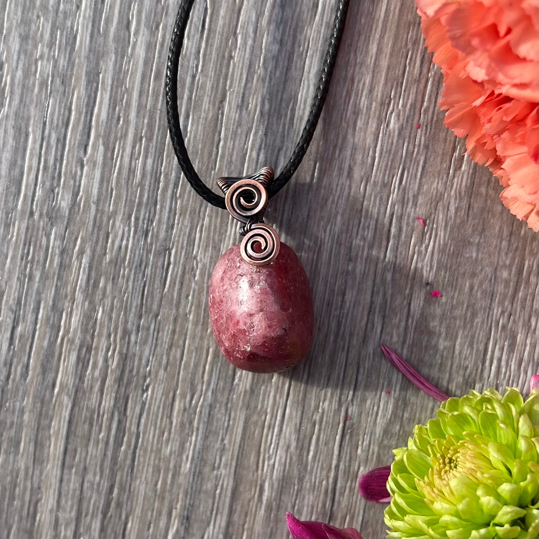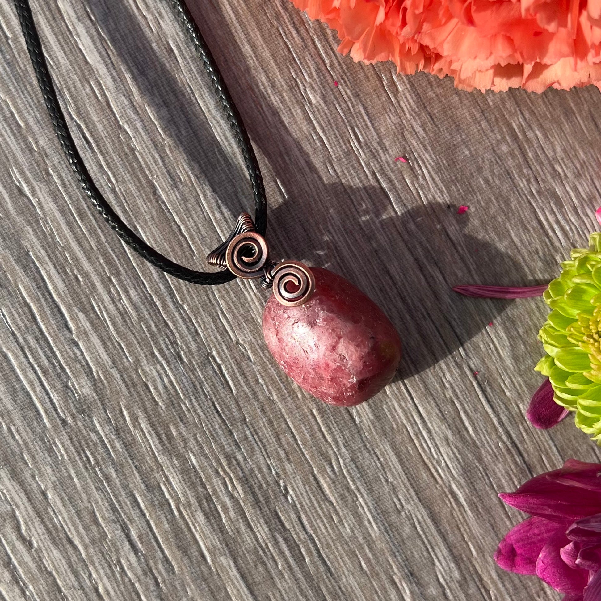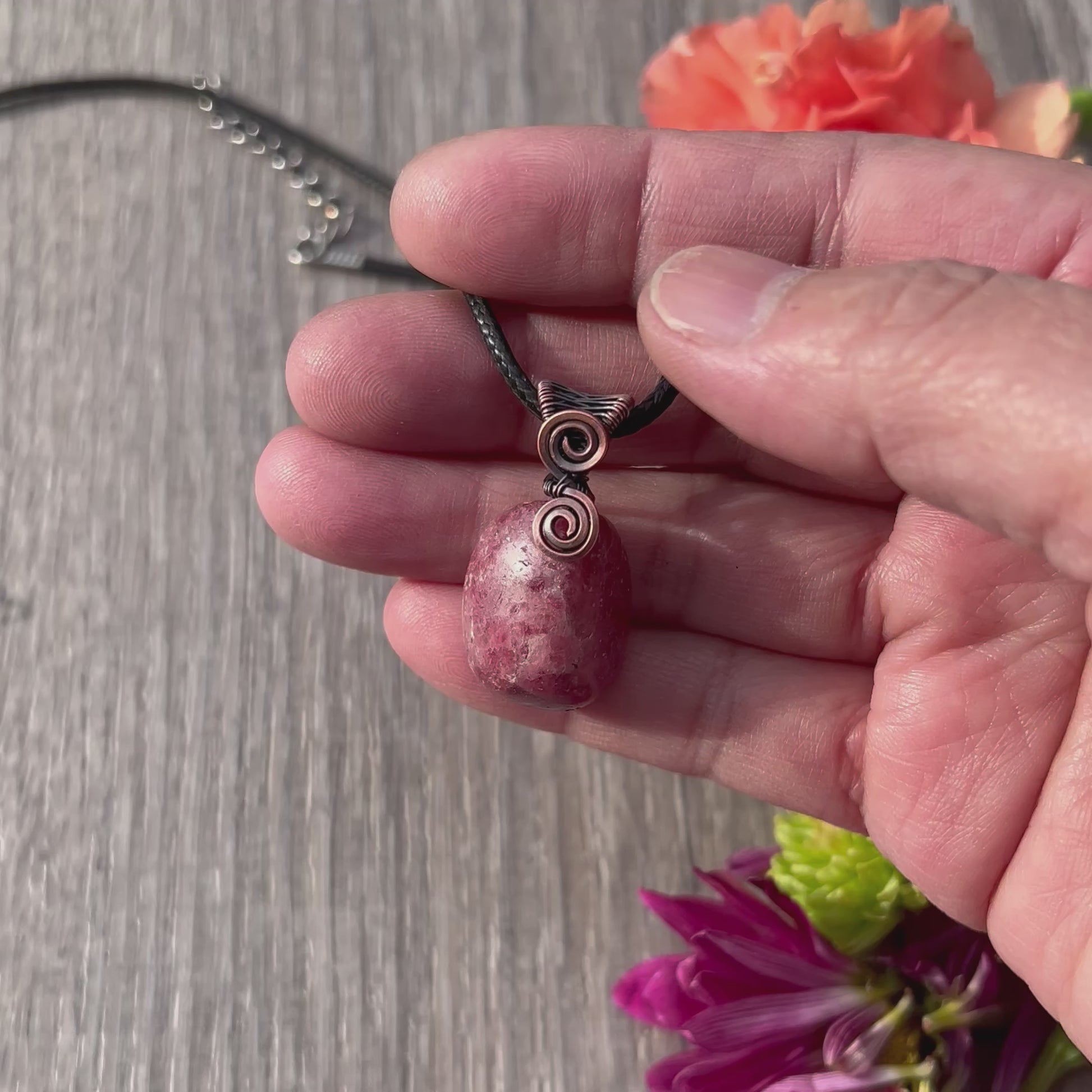 This pendant features a tumbled and drilled Thulite with Copper wire bail.