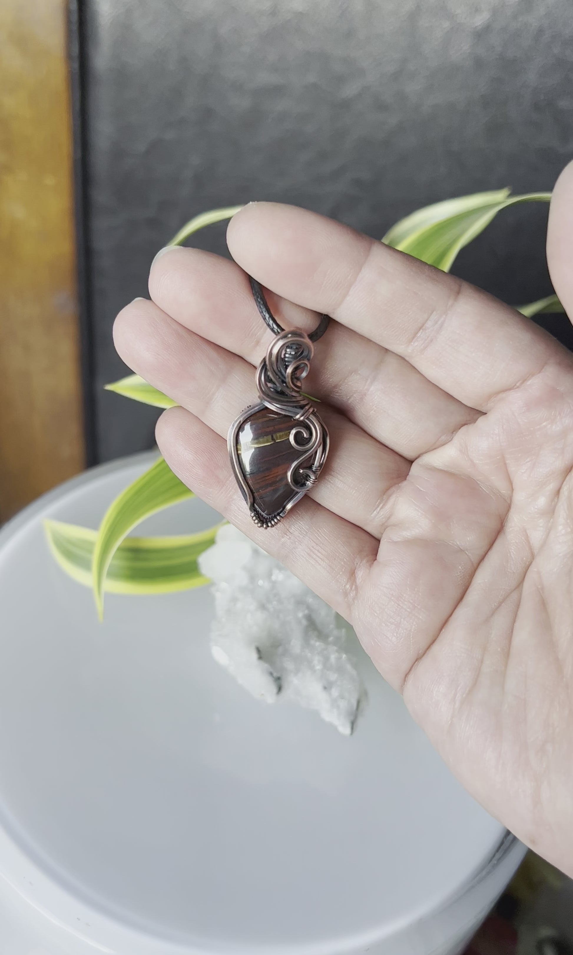 This beautiful pendant features Iron Tiger Eye, set in pure copper wire. This piece has been oxidized for an antique look.