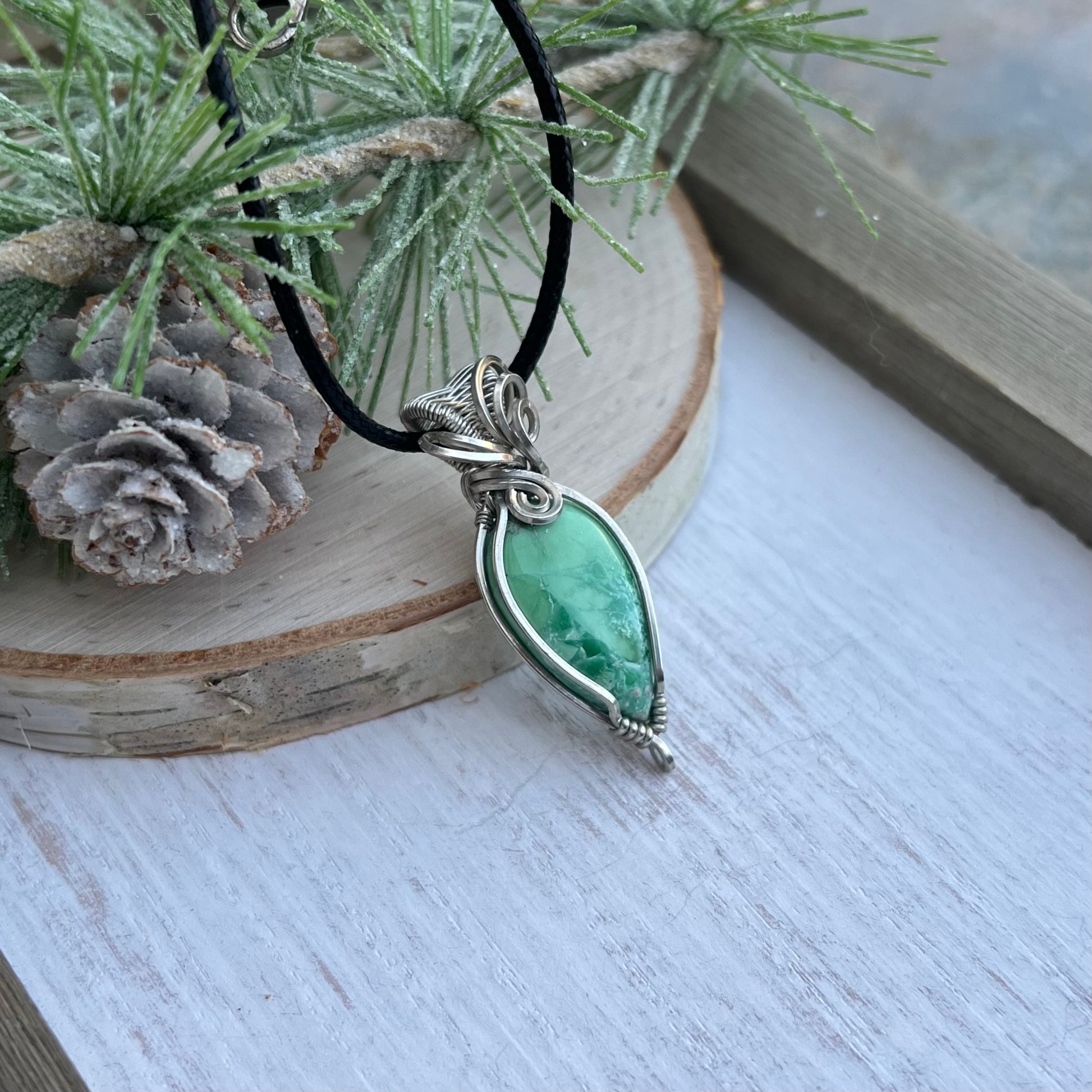 This beautiful pendant features Variscite wrapped in Argentium Silver.