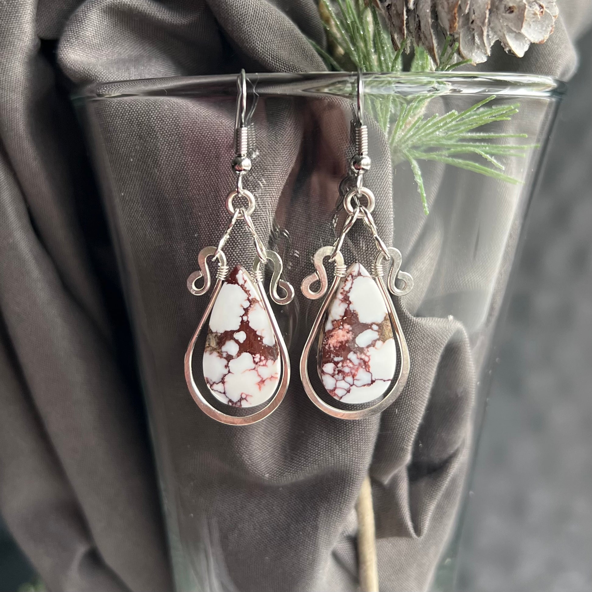 These beautiful earrings feature Wild Horse Stone framed in hammered Argentium Silver wire. Ear wires are made of stainless steel.